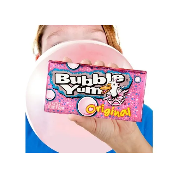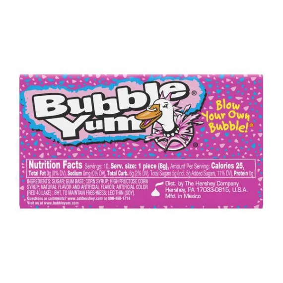 Details Ingredients Sugar; Gum Base; Corn Syrup; High Fructose Corn Syrup; Natural And Artificial Flavor; Artificial Color (Red 40 Lake); BHT (to Maintain Freshness); Caramel Color. Show more Product features BUBBLE YUM Bubble Gum is soft, so it’s easy to chew, and the classic Bubble Gum flavor lasts a long time, giving you more time to chew and create bigger bubbles. This flavorful gum will help you perfect your bubble-blowing skills and bring out the kid in you all over again! Bubble Yum, Original Bubble Gum, 2.8 Oz Soft and easy to chew Bubble gum flavor 25 calories per piece Long-lasting flavor Perfect for backpacks, lunch boxes, office, and travel Net Quantity of Content 10 X 8 G