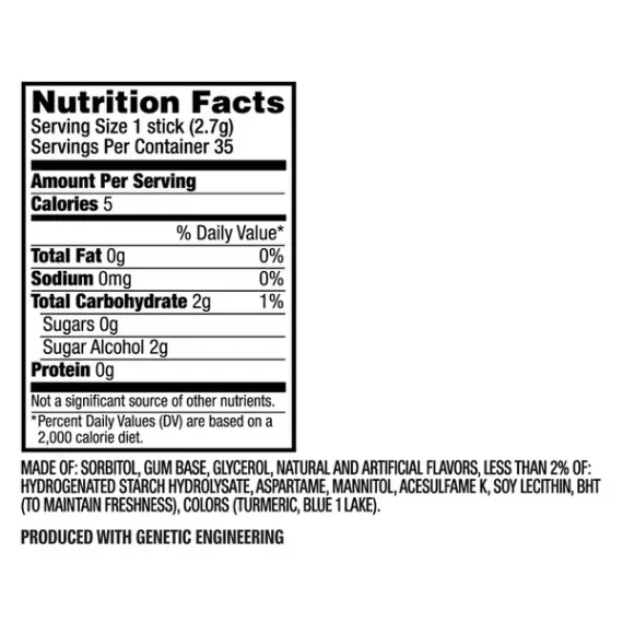 Details Ingredients Sorbitol, Gum Base, Glycerol, Natural and Artificial Flavors, Hydrogenated Starch Hydrolysate; Less than 2% of: Aspartame, Mannitol, Soy Lecithin, Acesulfame K, BHT (to Maintain Freshness), Color (Blue 1 Lake). Show more Product features Give Extra, get extra. Extra knows that when you give a little more, you get more in return. That's why there are more ways to share a moment in every pack. So give a piece to friends, family, or someone new. It might seem like something little, but sometimes the little things last the longest. Extra sugar-free chewing gum: celebrating life's meaningful connections, one piece at a time. Package includes one (1) 35-piece pack of Extra Spearmint Sugar Free Chewing Gum Crisp, invigorating refreshment from head to toe. Give Extra, get extra, because sometimes the little things last the longest. Sharing a piece of Extra gum helps you live life's little moments. Sugar-free chewing gum that’s perfect to share with friends, family, or someone new. Net Quantity of Content 35.0 X 1 stick (2.7g)
