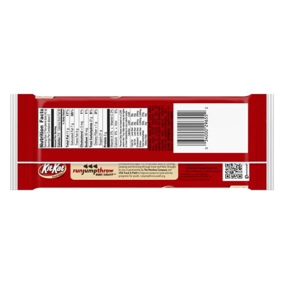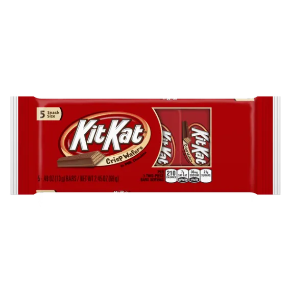 Details Ingredients SUGAR; WHEAT FLOUR; NONFAT MILK; COCOA BUTTER; CHOCOLATE; PALM KERNEL OIL; LACTOSE (MILK); MILK FAT; CONTAINS 2% OR LESS OF: SOY LECITHIN; PGPR, EMULSIFIER; YEAST; VANILLIN, ARTIFICIAL FLAVOR; SALT; SODIUM BICARBONATE. Show more Product features Take a break with snack-size bars of crispy wafers and milk chocolate. These individually wrapped KIT KAT snack size candy bars are the perfect size for tucking into lunch boxes and desk drawers, or sharing with friends. KIT KAT® Snack Size Wafer Bars, 5 count:Perfect for everyday snacking and sharingLayers of crisp wafers covered in milk chocolateKosher candy barsDelicious on their own or as edible party decor and favors Net Quantity of Content ABOUT 2 X 42 g