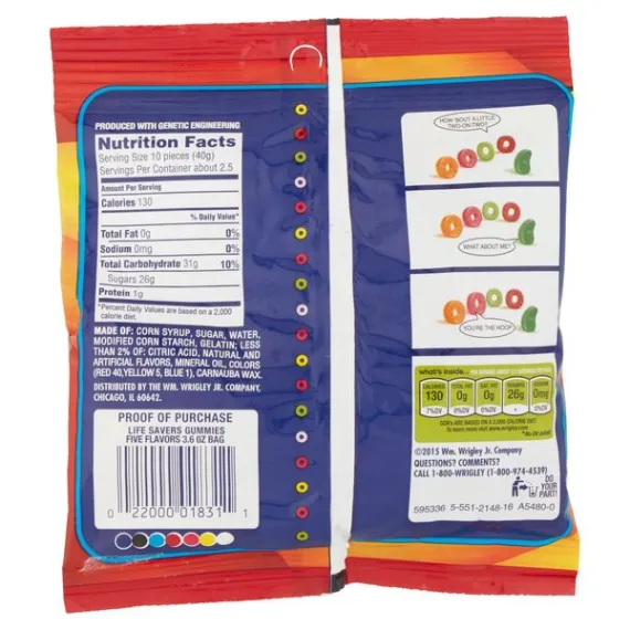 Details Ingredients Corn Syrup, Sugar, Water, Modified Corn Starch, Gelatin, Less than 2% of: Citric Acid, Natural and Artificial Flavors, Mineral Oil, Colors (Red 40, Yellow 5, Blue1), Carnauba Wax Show more Product features Cherry, Watermelon, Green Apple, Strawberry, Orange Lifesavers 2 Ls Gummies 5 Flavors 3.6oz Peg Net Quantity of Content ABOUT 2.5 X 40 g