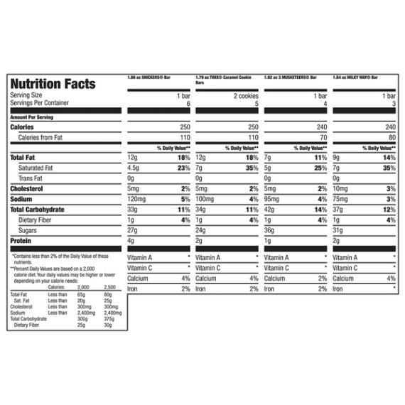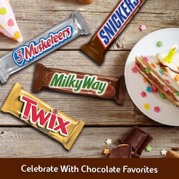 Details Ingredients Twix Caramel Cookie Bars: Milk Chocolate (Sugar, Cocoa Butter, Chocolate, Skim Milk, Lactose, Milkfat, Soy Lecithin, PGPR, Artificial Flavors), Sugar, Enriched Wheat Flour (Wheat Flour, Niacin, Reduced Iron, Thiamine Mononitrate, Riboflavin, Folic Acid), Palm Oil, Corn Syrup, Skim Milk, Dextrose, Less than 2% - Food Starch-Modified, Salt, Cocoa Powder, Baking Soda, Soy Lecithin, Artificial Flavor. 3 Musketeers Bar: Milk Chocolate (Sugar, Chocolate, Cocoa Butter, Skim Milk, Lactose, Milkfat, Soy Lecithin), Sugar, Corn Syrup, Hydrogenated Palm Kernel Oil and/or Palm Oil, Less than 2% - Cocoa Powder Processed with Alkali, Salt, Egg Whites, Artificial and Natural Flavors. Snickers Bar: Milk Chocolate (Sugar, Cocoa Butter, Chocolate, Skim Milk, Lactose, Milkfat, Soy Lecithin, Artificial Flavor), Peanuts, Corn Syrup, Sugar, Palm Oil, Skim Milk, Lactose, Salt, Egg Whites, Artificial Flavor. Show more Product features This variety pack features 18 full-sized candy bars, including SNICKERS Chocolate Bars, TWIX Caramel and Chocolate Bars, MILKY WAY Candy Bars and 3 MUSKETEERS Chocolate Bars. This assorted chocolate box is fun for any holiday party, from Christmas to Halloween, and everything in between. Make sure you're the hero house on Halloween night or the favorite party guest. Contains one 33.31-ounce, 18-count box of full-size, individually wrapped SNICKERS, TWIX, 3 MUSKETEERS and MILKY WAY Chocolate Bars These full-size chocolate bars are great to share as an afternoon chocolate treat with friends Be the office hero with this variety box of favorite MARS Chocolate Bars With this assortment of some of the best MARS Chocolate Brands, this box will please friends, family and party guests MARS Chocolate Candy Bars are great for movie theaters, gift baskets and stocking stuffers