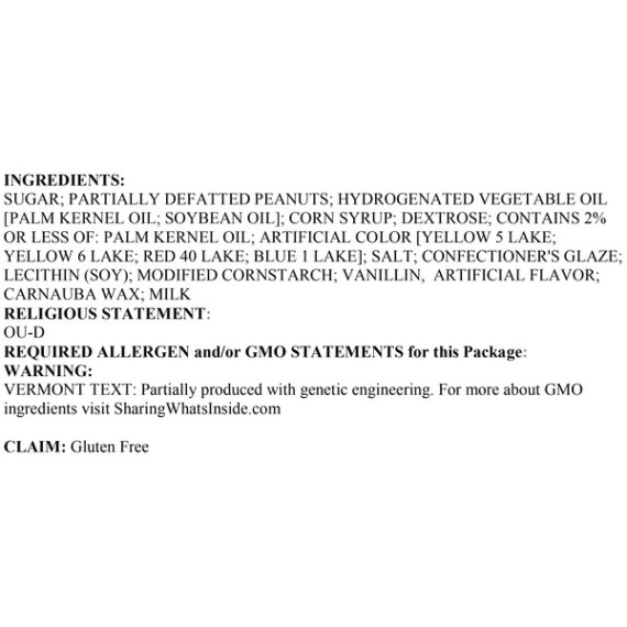 Details Ingredients Sugar, Partially Defatted Peanuts, Hydrogenated Vegetable Oil (Palm Kernel Oil, Soybean Oil), Corn Syrup, Dextrose, Contains 2% or Less of: Palm Kernel Oil, Artificial Color (Yellow 5 Lake, Yellow 6 Lake, Red 40 Lake, Blue 1 Lake), Salt, Confectioner's Glaze, Lecithin (Soy), Modified Cornstarch, Vanillin Artificial Flavor, Carnauba Wax, Milk. Show more Product features Keep your candy bowls filled with crunchy, delicious, REESE'S PIECES Peanut Butter Candy. Your friends and family will empty the candy dish as fast as you can fill it! Perfect for snacking and watching TVPeanut butter taste in a crunchy candy shellColorful candy for your candy bowlA kosher candy Special Features Kosher dairy Net Quantity of Content 3 X 51 Pieces (40 g)