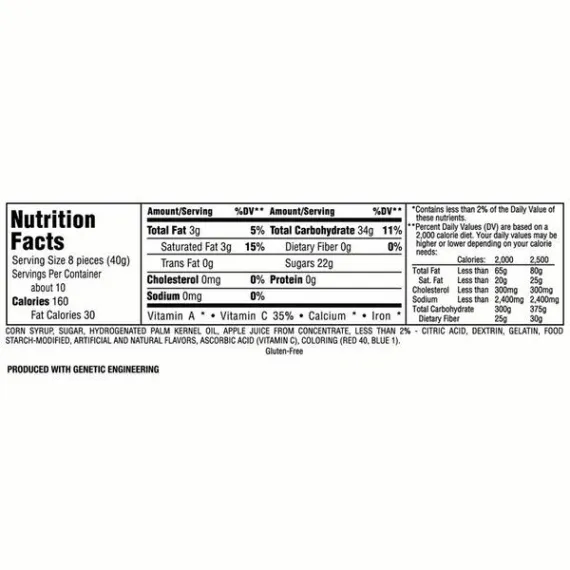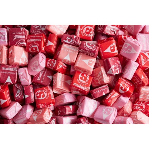 Details Ingredients Corn Syrup, Sugar, Hydrogenated Palm Kernel Oil, Apple Juice from Concentrate, Less than 2% of: Citric Acid, Dextrin, Gelatin, Food Starch-Modified, Artificial and Natural Flavors, Ascorbic Acid (Vitamin C), Coloring (Red 40, Blue 1). Show more Product features Have you experienced the unexpectedly juicy burst of bold fruit flavor inside every Starburst candy? Treat yourself to the extraordinary juiciness that defines these beloved chewy candies. From Starburst candies right out of the wrapper to Starburst recipes and decorations, there are endless ways to add a burst of juicy flavor every day, including adding them to your next party. Package includes 14 ounce bag of STARBURST FaveREDs Fruit hew Candy Starburst can be enjoyed alone or as a burst of juicy flavor added to your favorite recipes Add an unexplainably juicy treat to your party, around your house - or stash a few for snacking later. Your favorite juicy red flavors - strawberry, fruit punch, watermelon, and cherry - together in one pack. Gluten-free, fruit-flavored candy chews with a soft, chewy texture Net Quantity of Content 10.0 X 8 Pieces (40g)