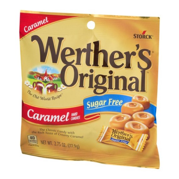 Details Ingredients Isomalt, Butter, Cream, Salt, Artificial Flavoring, Soy Lecithin Emulsifier, Sweetener Acesulfame-K. Product features Enjoy these Werther's Original Caramel Hard Candies at any time of the day without any guilt. They have a smooth and creamy flavor. This 2.75 oz bag of delicious, sugar-free hard candy has just 40 calories per serving, making them a nice choice for weight conscious people. They are individually wrapped, making them easy to slip them into your bag or desk drawer. Have some Werther's Original hard candy in between meals or as a dessert. They are fun to share with a loved one. Werther's Original Hard Candies:1/3 fewer calories than regular Werther's Original Hard CandyWerther's Original hard candy has 0 sugar carbsThe classic candy with the rich taste of creamy caramelSugar-free hard candy has a smooth and delicious flavorOnly 40 calories each serving2.75 oz bagNice treat for those that are trying to lose weightIndividually wrappedEasy to place a few in your desk or in your pocket to enjoy later Net Quantity of Content 5 X 16 g