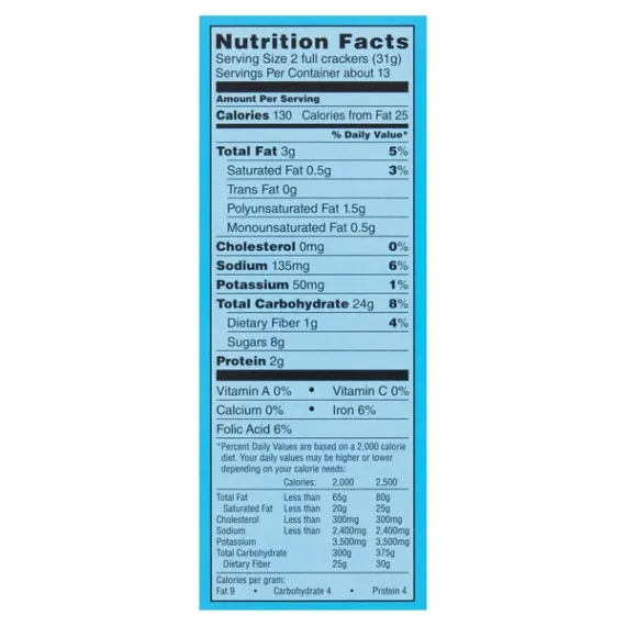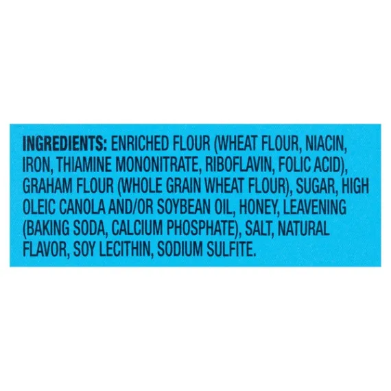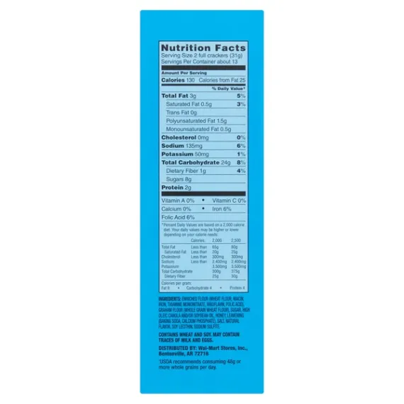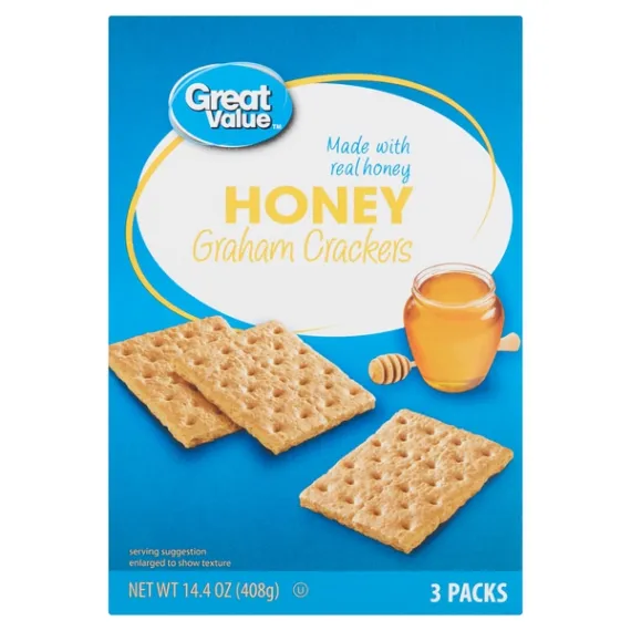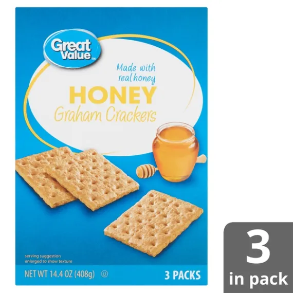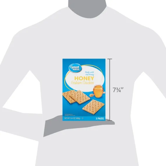 Details Ingredients ENRICHED FLOUR (WHEAT FLOUR, NIACIN, REDUCED IRON, THIAMINE MONONITRATE, RIBOFLAVIN, FOLIC ACID), GRAHAM FLOUR (WHOLE GRAIN WHEAT FLOUR), SUGAR, CANOLA AND/OR SOYBEAN AND/OR PALM OIL, HONEY, CONTAINS 2% OR LESS OF: SALT, BAKING SODA, SOY LECITHIN, CALCIUM PHOSPHATE (LEAVENING), ARTIFICIAL FLAVOR, SODIUM SULFITE. Show more Product features 8g whole grain**USDA recommends consuming 48g or more whole grains per day.Enjoy the deliciously sweet taste of Great Value Honey Graham Crackers. Made with real honey, our graham crackers are delicious on their own, and the perfect vehicle for tasty s'mores, jams and preserves, peanut butter, or a schmear of chocolate hazelnut spread. With a crunchy and sweet honey taste from your childhood, these graham crackers are enjoyed by the young and the young at heart. Little ones will love these in school lunches or as an after-school snack. The graham cracker squares are lightly perforated, which makes snapping into smaller portions a sinch. This makes them an ideal option for little hands, as appetizer-style bites, or as a sweet and crunchy garnish for ice cream sundaes. Get creative by crumbling up full sheets of our graham crackers for pie crusts for cheesecake and key lime pie. Each box comes with three sleeves of crackers, containing 13 servings, making them a great choice for large parties and gatherings. Great Value Honey Graham Crackers are a delightful treat, backed by our quality guarantee.Great Value products provide families with affordable, high quality grocery and household consumable options. With our wide range of product categories spanning grocery and household consumables, we offer you a variety of products for your family's needs. Our products are conveniently available online and in Walmart stores nationwide, allowing you to stock up and save money at the same time. Made with real honey3 packs14.4oz13 servings per box Special Features 5 grams Of whole grain per slice Net Quantity of Content ABOUT 13 X 31 g