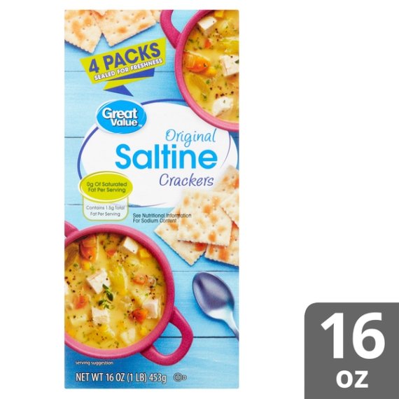 Details       Ingredients  ENRICHED FLOUR (WHEAT FLOUR, NIACIN, REDUCED IRON, THIAMINE MONONITRATE, RIBOFLAVIN, FOLIC ACID), VEGETABLE OIL (CONTAINS ONE OR MORE OF THE FOLLOWING: CANOLA OIL, CORN OIL, PALM OIL, SOYBEAN OIL), SALT, CONTAINS 2% OR LESS OF THE FOLLOWING: SODIUM BICARBONATE (LEAVENING), WHEAT GLUTEN, MALTED BARLEY FLOUR, YEAST.      Show more      Product features  Few pantry staples are as versatile as Great Value Original Saltine Crackers. These crisp, perfectly salted crackers, which come in four individually sealed sleeves, are the ideal partner for soups, spreads, dips, and cheeses. They also make a great topping for mac and cheese, casseroles, and veggies, and are a crunchy and flavorful breading for fried chicken. They're also an amazing secret weapon in baked goods, with uses ranging from pie crusts to s'mores to fudge and toffee brittle. You'll never run out of uses for Great Value Original Saltine Crackers.    Great Value products provide families with affordable, high quality grocery and household consumable options. With our wide range of product categories spanning grocery and household consumables, we offer you a variety of products for your family's needs. Our products are conveniently available online and in Walmart stores nationwide, allowing you to stock up and save money at the same time.     1.5g of fat per serving   4 packs sealed for freshness   Free of saturated fat   Kosher       Net Quantity of Content   ABOUT 30 X 15 g