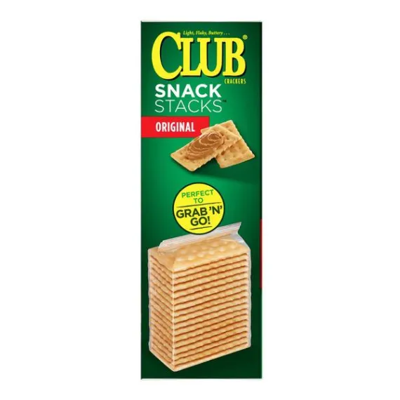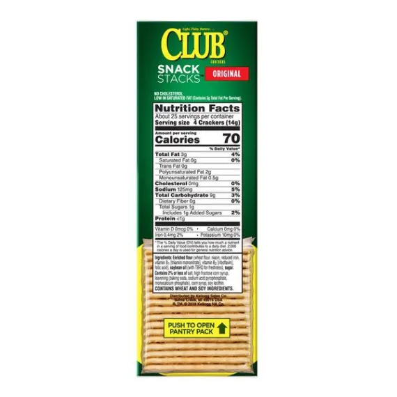 Details Ingredients Enriched Flour (Wheat Flour, Niacin, Reduced Iron, Thiamin Mononitrate [Vitamin B1], Riboflavin [Vitamin B2], Folic Acid), Soybean Oil with TBHQ for Freshness, Sugar, Contains Two Percent or Less of Salt, Leavening (Sodium Acid Pyrophosphate, Baking Soda, Monocalcium Phosphate), High Fructose Corn Syrup, Corn Syrup, Cornstarch, Soy Lecithin. Show more Product features Light, flaky, buttery Keebler Club Crackers Snack Stacks Original are a satisfying snack for any occasion. Made with quality ingredients, our Club Crackers are cholesterol free and low in saturated fat for enjoyable snacking. Packaged in a convenient Snack Stack for your busy lifestyle, it’s easier than ever to grab a pack and go. Deliciously crafted, these incredible crackers make a wonderful standalone snack or mini meal and go great with dips, cheese, fruit preserves, deli meats, and more. Add them to your party platter, pack a stack for lunch, and keep them on hand for a simple snack at school, work, or at home. Join the Club! Keebler Club Original Snack Stacks Crackers 12.5 Oz Light, flaky, buttery crackers with a touch of salt; Deliciously crafted for easy snacking at home, school, work, and more Cholesterol free and low in saturated fat (contains 3 grams total fat per serving); Ingredients contain wheat and soy A family-favorite, on-the-go snack that's perfect for kids and adults; Try them with soup, salad, dips, spreads, sliced cheese, and your favorite topping combinations Conveniently packaged and ready to travel; Pop a pouch in your kid's backpack and lunchbox; Stow some in your tote bag, car and desk for anytime snacking Includes 6, 2.08-ounce ready-to-eat Snack Stacks sized to fit your busy lifestyle; 4 crackers per serving, about 25 servings total; Individually wrapped for freshness and great taste Net Quantity of Content 25 X 4 Crackers (14g)
