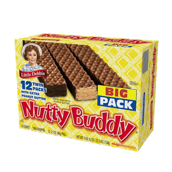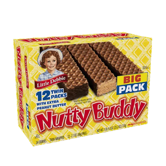 Details Ingredients DEXTROSE, PEANUT BUTTER, ENRICHED FLOUR (WHEAT FLOUR, NIACIN, REDUCED IRON, THIAMIN MONONITRATE [VITAMIN B1], RIBOFLAVIN [VITAMIN B2], FOLIC ACID), SUGAR, PALM AND SOYBEAN OILS WITH TBHQ AND CITRIC ACID TO PROTECT FLAVOR, PALM AND PALM KERNEL OIL, WATER. CONTAINS 2% OR LESS OF EACH OF THE FOLLOWING: SOY FLOUR, COCOA, SOYBEAN OIL, SALT, CORN STARCH, SOY LECITHIN, BAKING SODA, MONO- AND DIGLYCERIDES, CITRIC ACID, ARTIFICIAL FLAVOR, WHEY (MILK), EGG WHITES. Show more Product features Snack Cakes, Little Debbie Big Pack NUTTY BUDDY wafer bars. Little Debbie Big Pack NUTTY BUDDY wafer bars. Ready to eat. Nutty Bars, Big Pack Wafers with peanut butter. 12 twin packs with extra peanut butter. Twin-wrapped. A family bakery. Find us in your favorite convenience store. Unwrap a smile on the go! Our Family Promise: Quality, freshness and taste. Guaranteed fresh. www.Littledebbie.com. Send or have available the dated end panel. Special Features Big pack Net Quantity of Content 12 X 60 g
