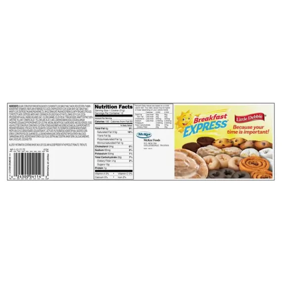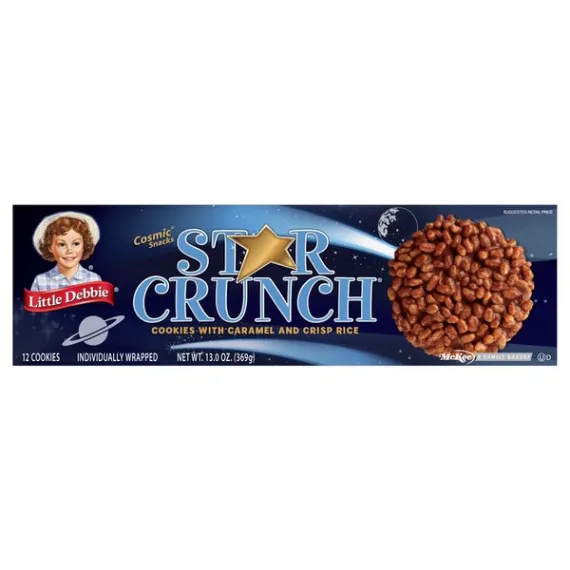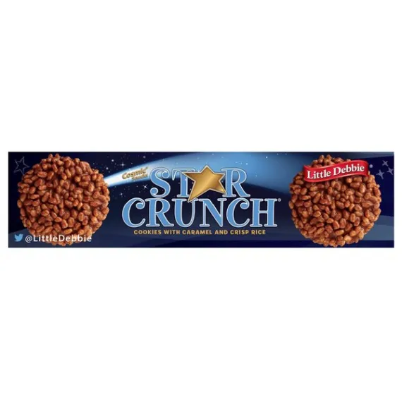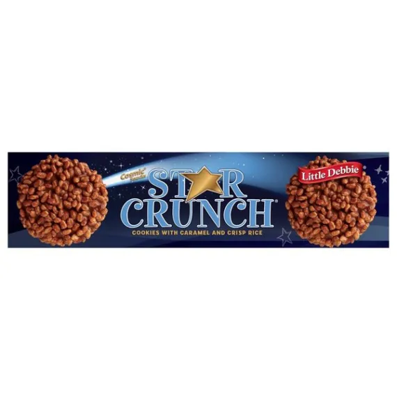 Details Ingredients SUGAR, CORN SYRUP, ENRICHED BLEACHED FLOUR (WHEAT FLOUR, BARLEY MALT, NIACIN, REDUCED IRON, THIAMIN MONONITRATE [VITAMIN B1], RIBOFLAVIN [VITAMIN B2], FOLIC ACID), CRISP RICE (RICE FLOUR, SUGAR, WHEY, SALT, BARLEY MALT, WHEAT FLOUR, DEXTROSE), PALM AND PALM KERNEL OIL, WHOLE GRAIN OATS, PALM AND SOYBEAN OILS WITH TBHQ AND CITRIC ACID TO PROTECT FLAVOR, DEXTROSE, WATER, WHEY. CONTAINS 2% OR LESS OF EACH OF THE FOLLOWING: SOY FLOUR, COCOA PROCESSED WITH ALKALI, RAISINS, MOLASSES, SALT, COLORS (CARAMEL COLOR, RED 40, TITANIUM DIOXIDE, ANNATTO EXTRACT, BETA CAROTENE, YELLOW 5, TURMERIC, BLUE 1, YELLOW 6 LAKE, BLUE 2 LAKE), LEAVENING (BAKING SODA, SODIUM ALUMINUM PHOSPHATE, SODIUM ACID PYROPHOSPHATE), SOY LECITHIN, NATURAL AND ARTIFICIAL FLAVORS, MONO- AND DIGLYCERIDES, EGGS, HIGH FRUCTOSE CORN SYRUP, CORN STARCH, GLYCERIN, POTASSIUM SORBATE AND SORBIC ACID AND CALCIUM PROPIONATE (TO PRESERVE FRESHNESS), CITRIC ACID, PECTIN, EGG WHITES, SODIUM CITRATE, POLYSORBATE 60, SORBITAN MONOSTEARATE, PROPYLENE GLYCOL MONOSTEARATE, SODIUM STEAROYL LACTYLATE, POLYSORBATE 80, NONFAT DRY MILK, MODIFIED CORN STARCH, CORN SYRUP SOLIDS, GUAR AND CELLULOSE AND KARAYA GUMS, DATEM, MODIFIED TAPIOCA STARCH, MALIC ACID, CARRAGEENAN, SPICES, MODIFIED WHEAT STARCH, EGG YOLKS, DEXTRIN, MALTODEXTRIN, WHEAT GERM, CALCIUM CARBONATE, AGAR, CHOCOLATE, COCOA BUTTER. Show more Product features Snack Cakes, Little Debbie Family Pack STAR CRUNCH cosmic snacks. Little Debbie STAR CRUNCH cosmic snacks. Ready to eat. Star Crunch Cookies Cookies with caramel and crisp rice. Cosmic snacks. Individually wrapped. Net Quantity of Content 12 X 31 g