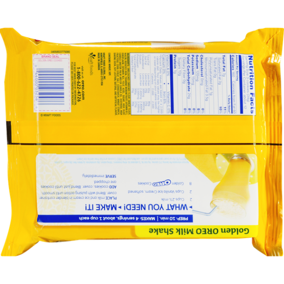 Details Ingredients Unbleached Enriched Flour (Wheat Flour, Niacin, Reduced Iron, Thiamine Mononitrate {Vitamin B1}, Riboflavin {Vitamin B2}, Folic Acid), Sugar, Canola And/Or Palm Oil, High Fructose Corn Syrup, Salt, Baking Soda, Soy Lecithin, Artificial Flavor, Natural Flavor. Show more Product features Nabisco Golden Oreo Sandwich Cookies. Sealed. Slit appears when opened.Stop. Open with pull tab on top!. Nabisco Golden Oreo Sandwich Cookies.Sealed.Slit appears when opened.Open with pull tab on top!Kraft Foods.Nutrition information per serving: 310 calories, 147g total fat, 7g saturated fat, 40mg, cholesterol, 190mg sodium, 38g carbohydrate, 0g dietary fiber, 28g, sugar, 7g protein.Substitute for a lower calorie and fat option use reduced fat Oreo cookies and fat free Net Quantity of Content 12.0 X 3 cookies (34g)