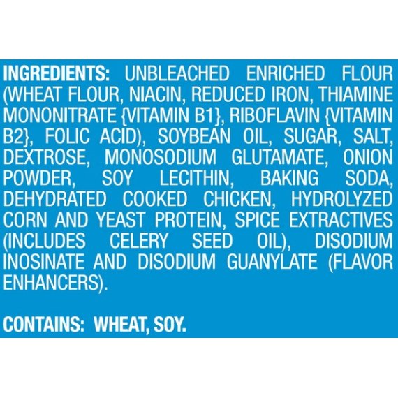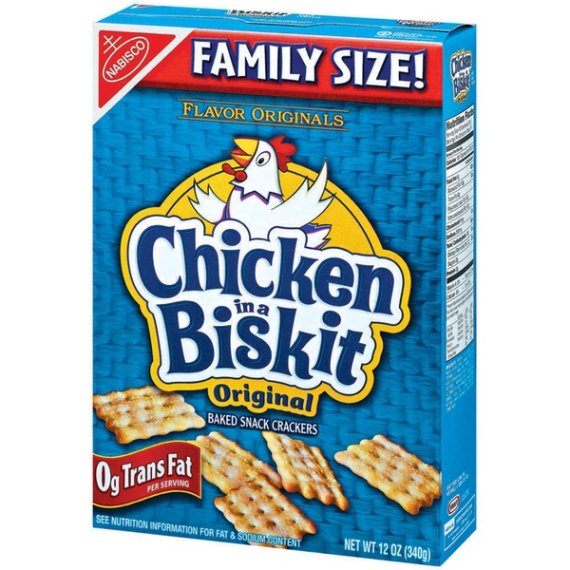 Details Ingredients Unbleached Enriched Flour (Wheat Flour, Niacin, Reduced Iron, Thiamine Mononitrate {Vitamin B1}, Riboflavin {Vitamin B2}, Folic Acid), Canola Oil, Sugar, Salt, Dextrose, Monosodium Glutamate, Soy Lecithin, Baking Soda, Onion Powder, Dehydrated Cooked Chicken, Hydrolyzed Corn And Yeast Protein, Spice Extractives (Includes Celery), Disodium Inosinate And Disodium Guanylate (Flavor Enhancers). Show more Product features Nabisco Chicken in a Biskit Snack Crackers Original, 12 oz, feature delectable flavor and a crispy, satisfying texture. You can enjoy them as a snack or crumble a few on top of your favorite soup. These Nabisco Chicken in a Biskit crackers are free from trans fats. The family-sized box allows you to share them with guests, friends and family too. Nabisco Chicken in a Biskit Snack Crackers, Original, 12 oz:Family-sized boxOriginal flavor0 grams of trans fat per servingSee nutrition information for fat content12 oz box of Nabisco snack crackers Special Features Family size Net Quantity of Content 11.0 X 12 crackers (31g)