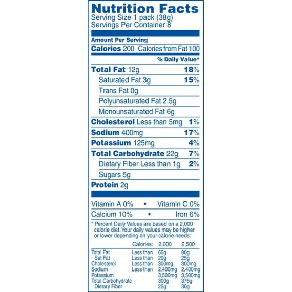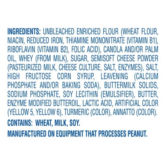 Details Ingredients Unbleached Enriched Flour (Wheat Flour, Niacin, Reduced Iron, Thiamine Mononitrate Vitamin B1, Riboflavin Vitamin B2, Folic Acid), Canola Oil, Palm Oil, Whey, Wheat Starch, Sugar, Semisoft Cheese Powder (Pasteurized Milk, Cheese Culture, Salt, Enzymes), High Fructose Corn Syrup, Salt, Buttermilk Solids, Leavening (Calcium Phosphate And/Or Baking Soda), Sodium Phosphate, Soy Lecithin, Butter, Enzyme Modified Butteroil, Calcium Phosphate, Lactic Acid, Yellow 5, Yellow 6, Vegetable Color (Annatto Extract And Turmeric). Peanut. Show more Product features Delicious Ritz Sandwich Crackers are the classic go-anywhere snack that kids and adults have loved for years, layering a mouthwatering real cheese spread between two crisp, Ritz crackers. Delicious Ritz Cracker Sandwiches are the classic go-anywhere snack that kids and adults love.Each layers a mouthwatering cheese spread, made with real cheese, between two crisp Ritz crackers.Ritz Cracker Sandwiches are a great anytime snack and perfect for lunchboxes or quick meals.Each individually wrapped pack is sealed for freshness and includes six Ritz Cracker Sandwiches.This includes eight 1.35oz packs of Ritz Cracker Sandwiches with Cheese.Highlights:Ritz Cracker Sandwiches with cheeseFilling Made with Real CheeseIndividually wrapped snack packs; each pack contains 6 cracker sandwichesEach snack pack contains 6 cracker sandwichesKosher Dairy; zero trans fat and cholesterol freeOur mission at Mondelez International is to create more moments of joy and build the best snacking company in the world by growing our people, growing our business and growing our impact on the world around us. Special Features With real cheese Net Quantity of Content 8 X 1 pack (38g)