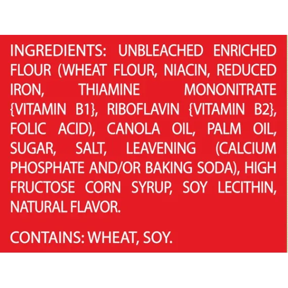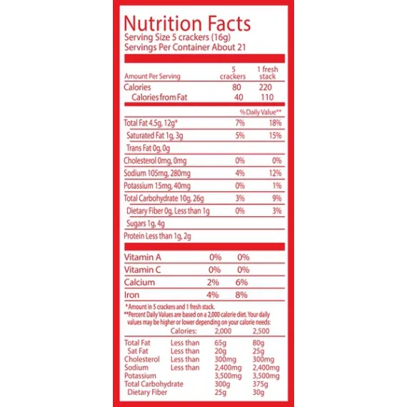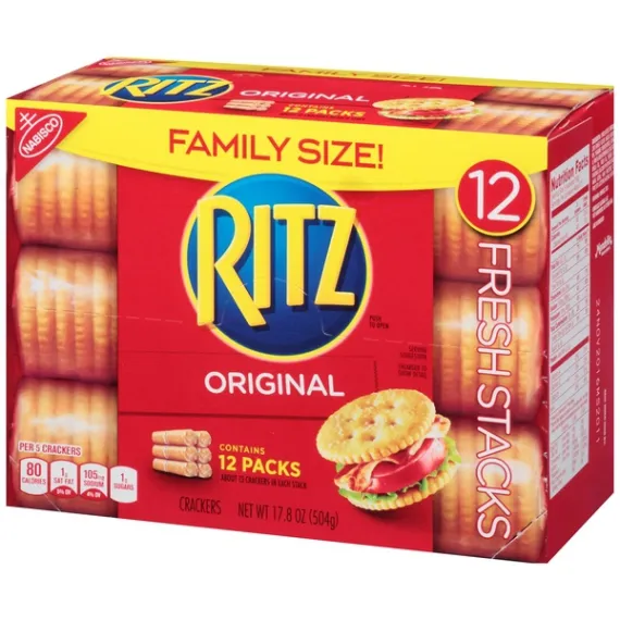 Details Ingredients Unbleached Enriched Flour (Wheat Flour, Niacin, Reduced Iron, Thiamine Mononitrate {Vitamin B1}, Riboflavin {Vitamin B2}, Folic Acid), Canola Oil, Palm Oil, Sugar, Salt, Leavening (Calcium Phosphate And/Or Baking Soda), High Fructose Corn Syrup, Soy Lecithin, Natural Flavor. Show more Product features Original Fresh Stacks Crackers Whether you're snacking on your own or creating a delicious treat for others, Ritz Crackers are the American classic that's enjoyed around the world.Original flavor Ritz Crackers are flaky and delicious with a taste that's perfect for pairing, topping, or popping.Ritz Crackers are a great anytime snack, the perfect complement for quick meals, and a versatile base for tasty party appetizers.Fresh Stacks keep Ritz crackers crisp and delicious, plus they're ideal for travel and events.This includes one 17.8oz Family Size box (12 Fresh Stacks) of Ritz Crackers Fresh Stacks.Highlights:Classic Ritz CrackersFlakey Ritz perfectionEach box contains 12 Fresh Stacks; About 13 Crackers in Each StackKosher DairyZero trans fat and cholesterol freeOur mission at Mondelez International is to create more moments of joy and build the best snacking company in the world by growing our people, growing our business and growing our impact on the world around us. Net Quantity of Content 32 X 5 crackers (16g)
