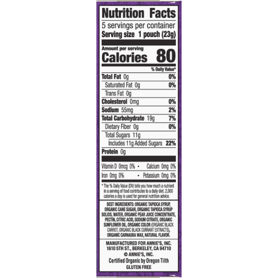 Details Ingredients Organic Tapioca Syrup, Organic Cane Sugar, Organic Tapioca Syrup Solids, Water, Organic Pear Juice Concentrate, Pectin, Citric Acid, Sodium Citrate, Organic Sunflower Oil, Organic Color (Organic Black Carrot, Organic Black Currant Extracts), Organic Carnauba Wax, Natural Flavor. Show more Product features Organic Berry Patch Bunny Fruit Snacks are a delicious mix of strawberry, cherry and raspberry flavored bunnies. Certified organic, these naturally vegan & gluten free bunny-shaped fruit snacks are made with real fruit juice and packed with 100% daily value of vitamin C. Fruit Snacks: Certified Organic, these naturally vegan & gluten free bunny-shaped Fruit Snacks are made with real fruit juice and packed with 100% daily value of vitamin C. Made with Goodness: No artificial flavors, synthetic colors, preservatives, or high-fructose corn syrup and made with real fruit juice and packed With 100% daily value of vitamin c Wholesome: Our first ingredient is always organic fruit for tasty snacks that are gluten free and perfect for on the go snacking or lunchtime Organic Snacking: Organic Fruit Snacks that are a delicious option for snack time and a portable grab and go treat Contains: A box of 5 Bunny Fruit Snacks Pouches fruit snack, fruit snacks, fruit strip, fruit strips, fruit shape, fruit shapes, organic fruit snacks, organic fruit strip, annie fruit snack, annies fruit snacks, annie's fruit snack, annie's fruit snacks, annies bunnies, annies bunny, annie's bunnies, annie's bunny snacks, lunchbox snack, lunchbox snacks, organic lunchbox snack, organic snack, organic lunch snack, vegan snack, vegan lunchbox snack, gluten free snack, gluten free lunchbox snack, box tops for Education Special Features No artificial colors Net Quantity of Content 5 X 1 pouch (23g)
