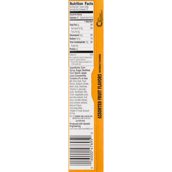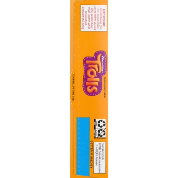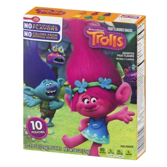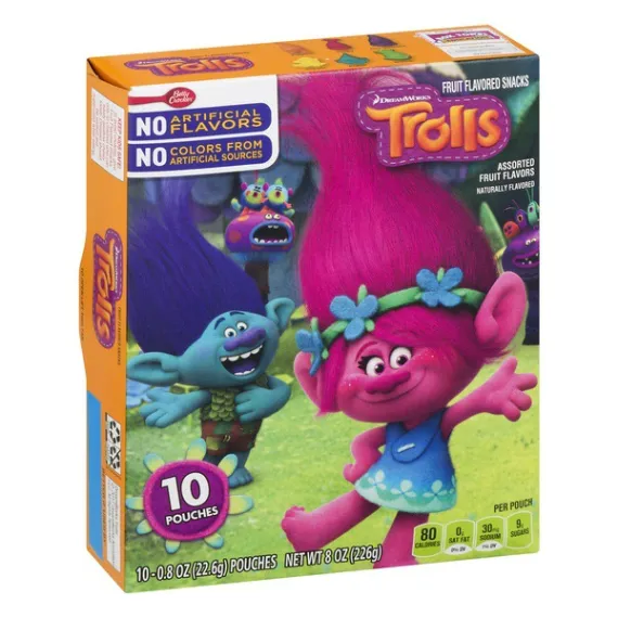 Details Ingredients Corn Syrup, Sugar, Modified Corn Starch, Apple Juice Concentrate. Contains 2% or Less of: Citric Acid, Fruit Pectin, Sodium Citrate, Malic Acid, Dextrose, Vitamin C (Ascorbic Acid), Sunflower Oil†, Color (Vegetable Juice, Spirulina Extract, Fruit Juice, Annatto Extract, and Turmeric Extract), Natural Flavor, Carnauba Wax.†Adds a Trivial Amount of Fat. Show more Product features Kids of all ages will love these naturally flavored, gluten free gummy treats. No artificial flavors or colors, just 80 calories and fat free. They're also an excellent source of vitamin C. NATURALLY FLAVORED: Fruit-flavored, gummy treats made with no artificial flavors for a delicious fat free, gluten free snack WHOLESOME: Contains an excellent source of Vitamin C for a sweet snack you can feel great about SNACKS FOR KIDS: Fruit pouches with your favorite Trolls shapes for endless fun ON-THE-GO SNACK: 80 calories per pouch, these individual snacks are the perfect addition to any day out BOX CONTAINS: 1 box, 10 pouches of Trolls kids snacks; assorted flavors Natural Flavors 80 calories fruit snack, fruit snacks, fruit strip, fruit strips, fruit shape, fruit shapes, lunchbox snack, lunchbox snacks, gluten free snack, gluten free lunchbox snack, gluten free, box tops, box tops for education Net Quantity of Content 10 X 1 pouch (23g)