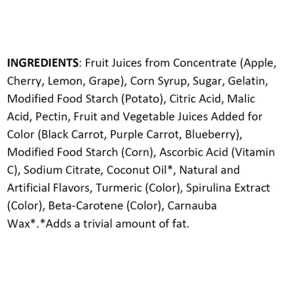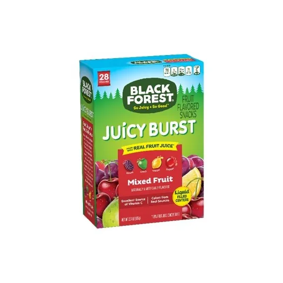 Details Ingredients Corn Syrup, Sugar, Apple Juice Concentrate, Gelatin, Modified Food Starch (Potato), Citric Acid, Malic Acid, Pectin, Modified Food Starch (Corn), Ascorbic Acid (Vitamin C), Sodium Citrate, Coconut Oil*, Natural and Artificial Flavors, Fruit and Vegetable Juices Added for Color (Black Carrot, Purple Carrot, Blueberry), Turmeric (Color), Spirulina Extract (Color), Beta-Carotene (Color), Carnauba Wax*, Cherry Juice Concentrate, Lemon Juice Concentrate, Grape Juice Concentrate, *Adds a Trivial amount of Fat Show more Product features Enjoy a tangy and sweet snack when on the go with these Black Forest Natural Fruit Snacks, Fruit Medley, 0.8 oz, 28 count. This handy 28-count box contains individually wrapped packs. Each pouch of Black Forest fruit snacks features four different fruity flavors. Black Forest Fruit Snacks, Fruit Medley, 0.8 Oz, 28 Ct:Each serving feature 100% of the daily recommended serving of vitamin CMade with real fruit juiceColors from natural sourcesDelicious and healthy fruit snacks Net Quantity of Content 28 X 23 g