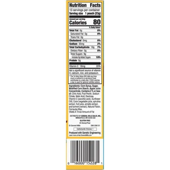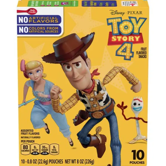 Details Ingredients Corn Syrup, Sugar, Modified Corn Starch, Apple Juice Concentrate. Contains 2 % or Less of: Citric Acid, Fruit Pectin, Sodium Citrate, Malic Acid, Dextrose, Vitamin C (Ascorbic Acid), Sunflower Oil†, Color (Vegetable Juice, Spirulina Extract, Fruit Juice, Annatto Extract, and Turmeric Extract), Natural Flavor, Carnauba Wax.†Adds a Trivial Amount of Fat. Show more Product features Assorted Fruit Flavors: Naturally flavored strawberry, grape, orange, cherry. Made with real fruit juice, these fruit-flavored snacks are made with apple juice concentrate. Naturally Flavored; fruit flavored, gummy treats made with no artificial flavors for a delicious, fat free, gluten free snack Wholesome; contains an excellent source of Vitamin C for a sweet snack you can feel great about Snacks for the Kids; fruit pouches with Disney Toy Story shapes for endless fun On-The-Go Snack; 80 calories per pouch, these individual snacks are the perfect addition to any day out No colors from artificial sources fruit snack, fruit, snack, gummy, treat, fruit juice, fruit flavored, healthy, healthy snack, kid treat, kid snack, convenient snack, convenient treat, gluten free, gluten free snack, gluten free treat, naturally flavored, Disney Toy Story, Disney Net Quantity of Content 10 X 23.0