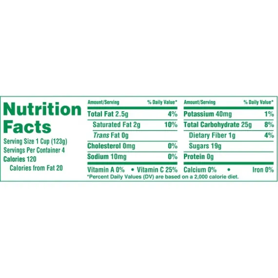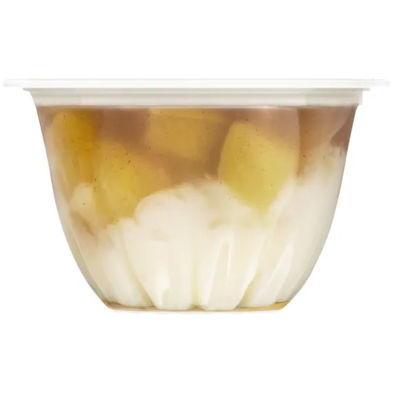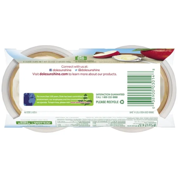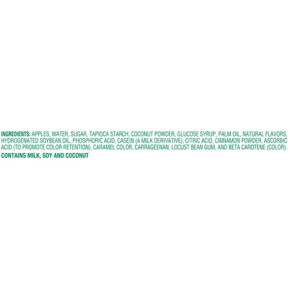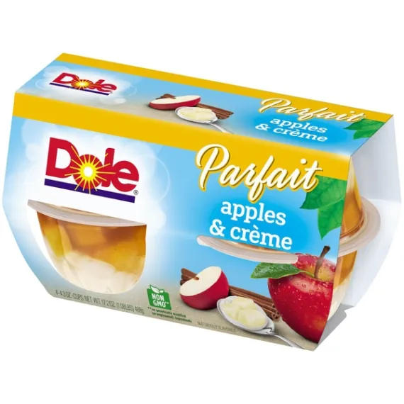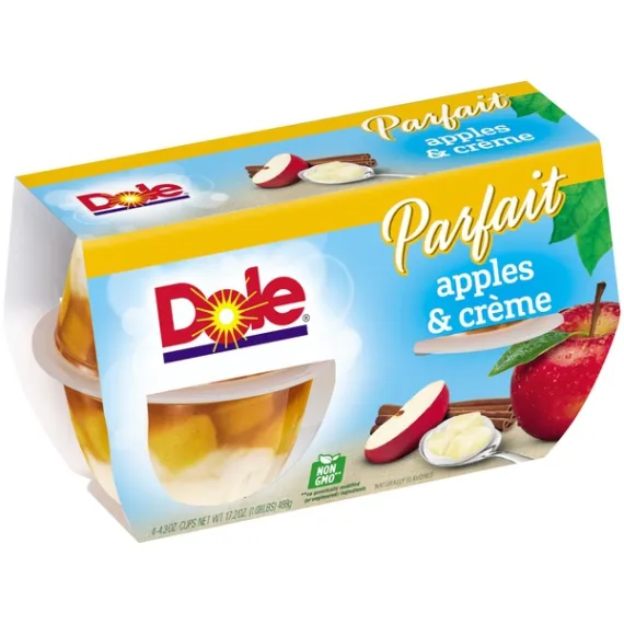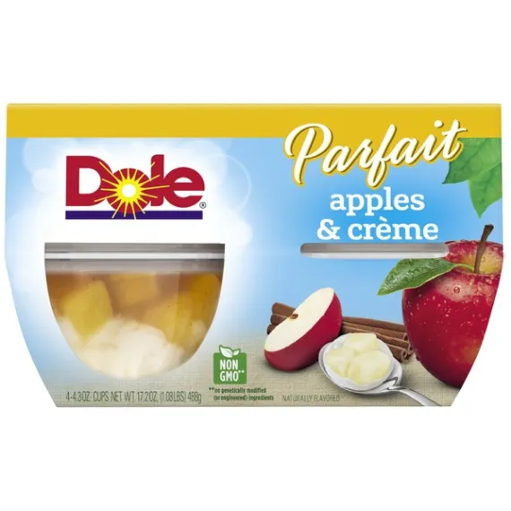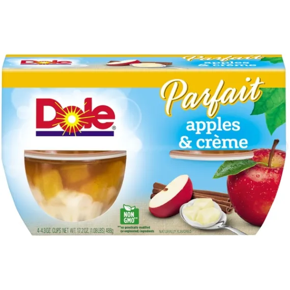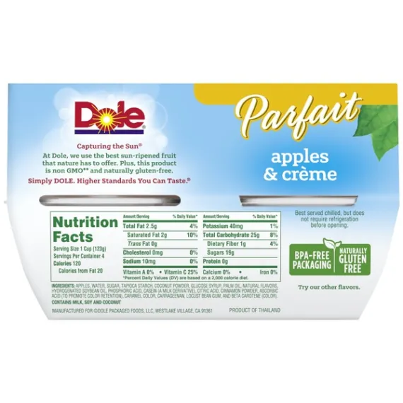 Details Ingredients APPLES, WATER, SUGAR, MODIFIED FOOD STARCH, COCONUT POWDER, GLUCOSE SYRUP, PALM OIL, NATURAL FLAVORS, HYDROGENATED SOY BEAN OIL, PHOSPHORIC ACID, CASEIN (A MILK DERIVATIVE), CINNAMON POWDER, ASCORBIC ACID (TO PROMOTE COLOR RETENTION), CARAMEL COLOR, CARRAGEENAN, LOCUST BEAN GUM, CITRIC ACID, AND BETA CAROTENE (COLOR). Show more Product features Reward your sweet cravings with the perfect heavenly treat. A cool, smooth layer of light-tasting creme comes together with crisp, diced apple for a delightfully satisfying snack. DOLE® Apple & Creme Parfait is made with nutritional goodness of real fruit, so itâs rich in Vitamin C and low in fat. Dole Fruit Bowls, Apples & Creme Parfait, 4.3 Ounce (4 Cups) Low Fat All Natural Fruit Rich in Vitamin C Gluten Free Perfect for snacking at home, at school, or on the go. Certified Non-GMO Learn more at: www.dolesunshine.com facebook.com/dolesunshine Special Features Low fat Net Quantity of Content 4 X 123 g
