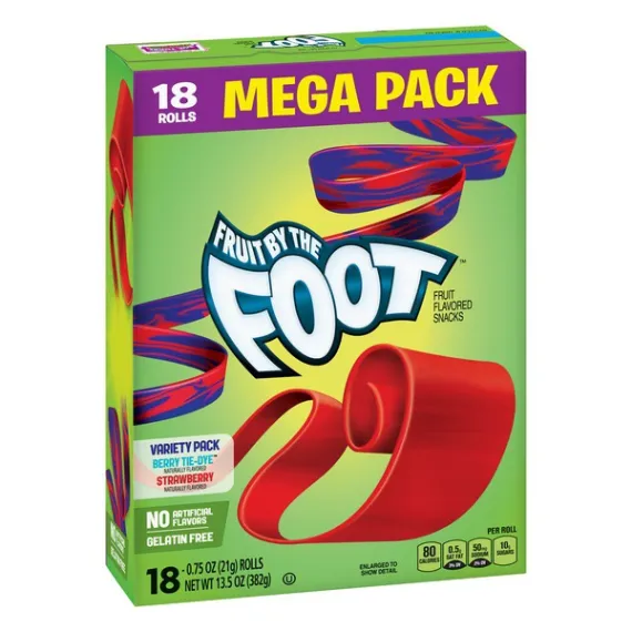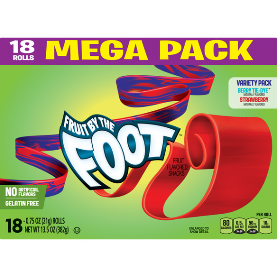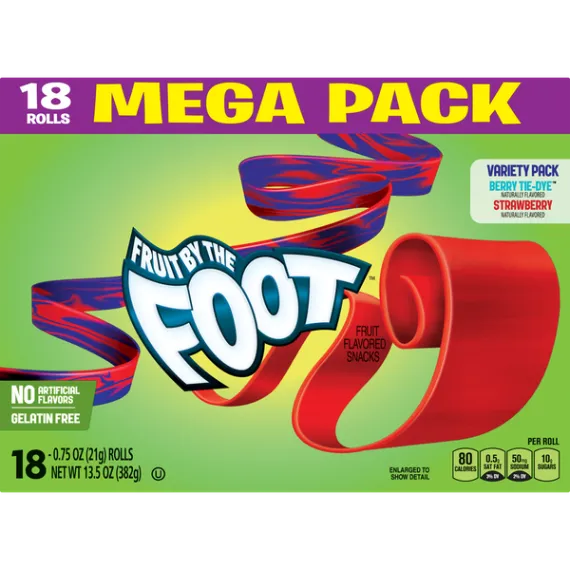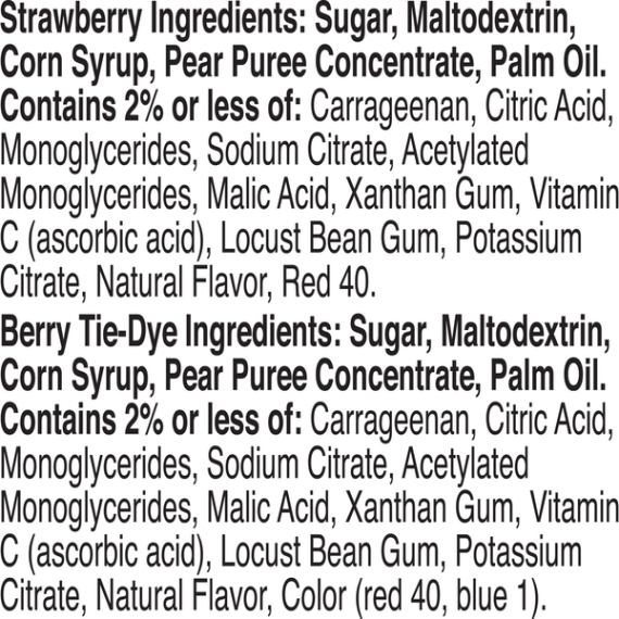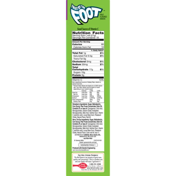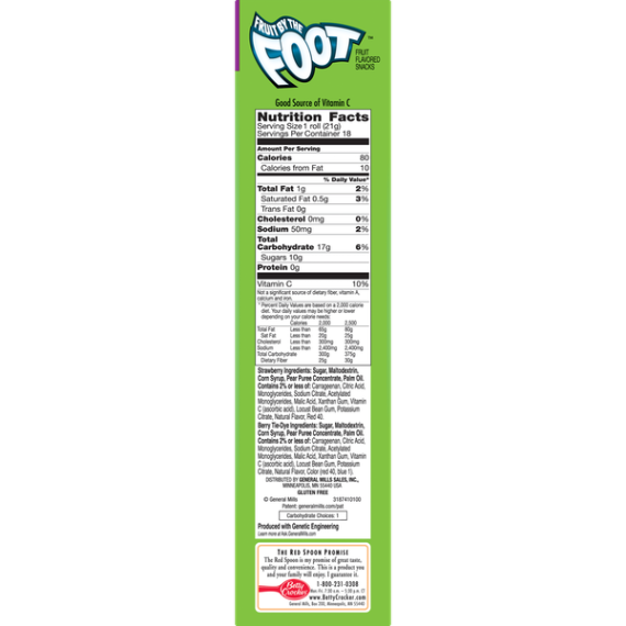 Details Ingredients Strawberry: Sugar, Maltodextrin, Corn Syrup, Pear Puree Concentrate, Palm Oil. Contains 2% or Less of: Carrageenan, Citric Acid, Monoglycerides, Sodium Citrate, Acetylated Monoglycerides, Malic Acid, Xanthan Gum, Vitamin C (Ascorbic Acid), Locust Bean Gum, Potassium Citrate, Natural Flavor, Red 40.Berry Tie-Dye: Sugar, Maltodextrin, Corn Syrup, Pear Puree Concentrate, Palm Oil. Contains 2% or Less of: Carrageenan, Citric Acid, Monoglycerides, Sodium Citrate, Acetylated Monoglycerides, Malic Acid, Xanthan Gum, Vitamin C (Ascorbic Acid), Locust Bean Gum, Potassium Citrate, Natural Flavor, Color (Red 40, Blue 1). Show more Product features Fruit by the foot kids snacks are a gluten and gelatin free snack. With foot long rolls of wild flavors and colors, the possibilities for fun are endless. Betty Crocker fruit by the foot fruit flavored snacks berry/strawberry are a fruit flavored gummy treat in fun shapes and flavors Made with no artificial flavors or preservatives Contains a good source of Vitamin C Perfect for lunchboxes or snack time Delicious option for kids and a portable grab and go treat Net Quantity of Content 18 X 1 roll (21g)