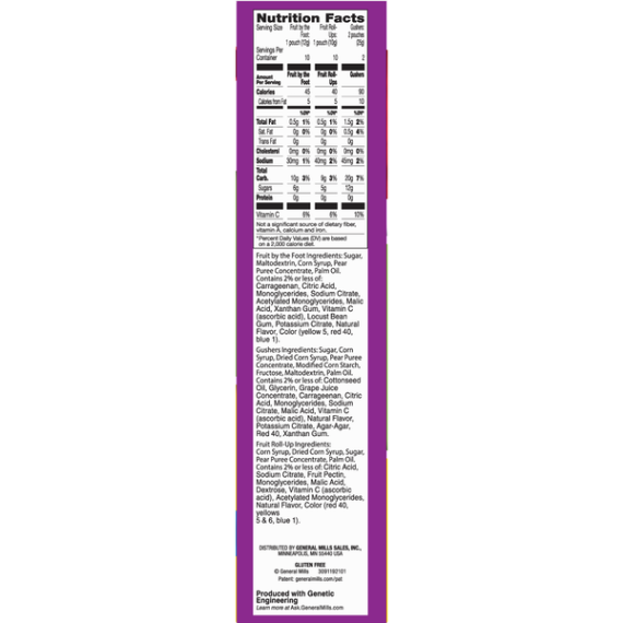 Details Ingredients Fruit by the Foot: Sugar, Maltodextrin, Corn Syrup, Pear Puree Concentrate, Palm Oil. Contains 2% or Less of: Carrageenan, Citric Acid, Monoglycerides, Sodium Citrate, Acetylated Monoglycerides, Malic Acid, Xanthan Gum, Vitamin C (Ascorbic Acid), Locust Bean Gum, Potassium Citrate, Natural Flavor, Color (Yellow 5, Red 40, Blue 1).Gushers: Sugar, Corn Syrup, Dried Corn Syrup, Pear Puree Concentrate, Modified Corn Starch, Fructose, Maltodextrin, Palm Oil. Contains 2% or Less of: Cottonseed Oil, Glycerin, Grape Juice Concentrate, Carrageenan, Citric Acid, Monoglycerides, Sodium Citrate, Malic Acid, Vitamin C (Ascorbic Acid), Natural Flavor, Potassium Citrate, Agar-Agar, Red 40, Xanthan Gum.Fruit Roll-Up: Corn Syrup, Dried Corn Syrup, Sugar, Pear Puree Concentrate, Palm Oil. Contains 2% or Less of: Citric Acid, Sodium Citrate, Fruit Pectin, Monoglycerides, Malic Acid, Dextrose, Vitamin C (Ascorbic Acid), Acetylated Monoglycerides, Natural Flavor, Color (Red 40, Yellows 5 & 6, Blue 1). Show more Product features Mini Fruit Roll-Ups, Fruit by the Foot, and Gushers variety pack of kids snacks are a gluten and gelatin free snack. With wild flavors and colors, the possibilities for fun are endless. Betty Crocker variety pack of mini size fruit roll-ups fruit by the foot and gushers are a fruit flavored gummy treat in fun shapes and flavors Made with no artificial flavors or preservatives Perfect for lunchboxes or snack time Contains a good source of Vitamin C Delicious option for kids and a portable grab and go treat fruit snack, fruit snacks, fruit strip, fruit strips, fruit shape, fruit shapes, lunchbox snack, lunchbox snacks, gluten free snack, gluten free lunchbox snack, gluten free Net Quantity of Content 2 X 2.0