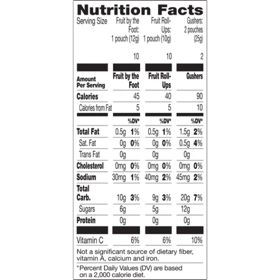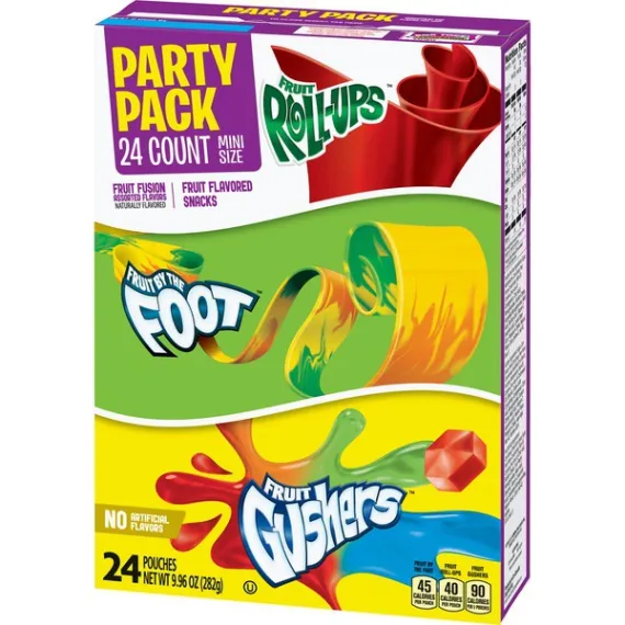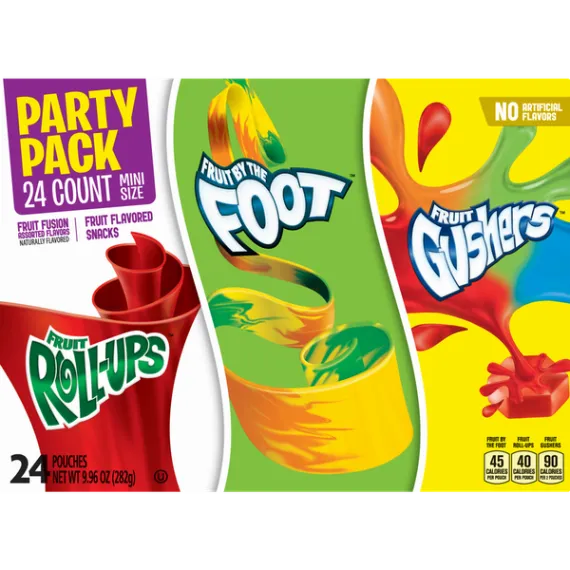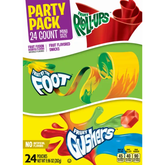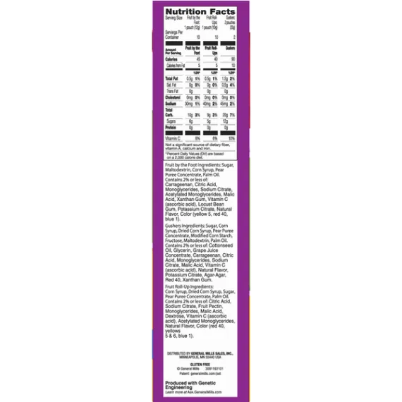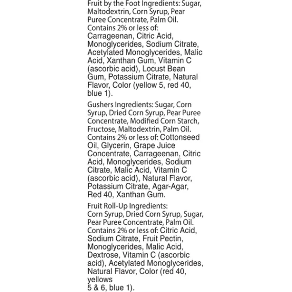 Details Ingredients Fruit by the Foot: Sugar, Maltodextrin, Corn Syrup, Pear Puree Concentrate, Palm Oil. Contains 2% or Less of: Carrageenan, Citric Acid, Monoglycerides, Sodium Citrate, Acetylated Monoglycerides, Malic Acid, Xanthan Gum, Vitamin C (Ascorbic Acid), Locust Bean Gum, Potassium Citrate, Natural Flavor, Color (Yellow 5, Red 40, Blue 1).Gushers: Sugar, Corn Syrup, Dried Corn Syrup, Pear Puree Concentrate, Modified Corn Starch, Fructose, Maltodextrin, Palm Oil. Contains 2% or Less of: Cottonseed Oil, Glycerin, Grape Juice Concentrate, Carrageenan, Citric Acid, Monoglycerides, Sodium Citrate, Malic Acid, Vitamin C (Ascorbic Acid), Natural Flavor, Potassium Citrate, Agar-Agar, Red 40, Xanthan Gum.Fruit Roll-Up: Corn Syrup, Dried Corn Syrup, Sugar, Pear Puree Concentrate, Palm Oil. Contains 2% or Less of: Citric Acid, Sodium Citrate, Fruit Pectin, Monoglycerides, Malic Acid, Dextrose, Vitamin C (Ascorbic Acid), Acetylated Monoglycerides, Natural Flavor, Color (Red 40, Yellows 5 & 6, Blue 1). Show more Product features Mini Fruit Roll-Ups, Fruit by the Foot, and Gushers variety pack of kids snacks are a gluten and gelatin free snack. With wild flavors and colors, the possibilities for fun are endless. Betty Crocker variety pack of mini size fruit roll-ups fruit by the foot and gushers are a fruit flavored gummy treat in fun shapes and flavors Made with no artificial flavors or preservatives Perfect for lunchboxes or snack time Contains a good source of Vitamin C Delicious option for kids and a portable grab and go treat fruit snack, fruit snacks, fruit strip, fruit strips, fruit shape, fruit shapes, lunchbox snack, lunchbox snacks, gluten free snack, gluten free lunchbox snack, gluten free Net Quantity of Content 2 X 2.0