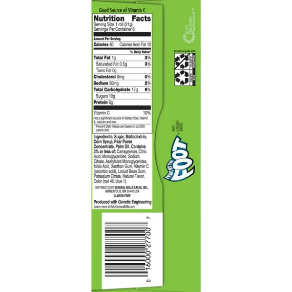 Details Ingredients Sugar, Maltodextrin, Corn Syrup, Pear Puree Concentrate, Palm Oil. Contains 2% or Less of: Carrageenan, Citric Acid, Monoglycerides, Sodium Citrate, Acetylated Monoglycerides, Malic Acid, Xanthan Gum, Vitamin C (Ascorbic Acid), Locust Bean Gum, Potassium Citrate, Natural Flavor, Color (Red 40, Blue 1). Show more Product features Fruit-flavored, gluten free gummy treats made with no artificial flavors for a delicious snack NATURALLY FLAVORED: Fruit-flavored, gummy treats made with no artificial flavors for a delicious gelatin free snack WHOLESOME: Contains a good source of Vitamin C for a sweet snack you can feel great about SNACKS FOR KIDS: With foot long rolls of wild flavors and colors, the possibilities for fun are endless ON-THE-GO SNACK: 80 calories per roll, these individual snacks are the perfect addition to any day out Berry tie-dye fruit by the foot kids snacks Special Features