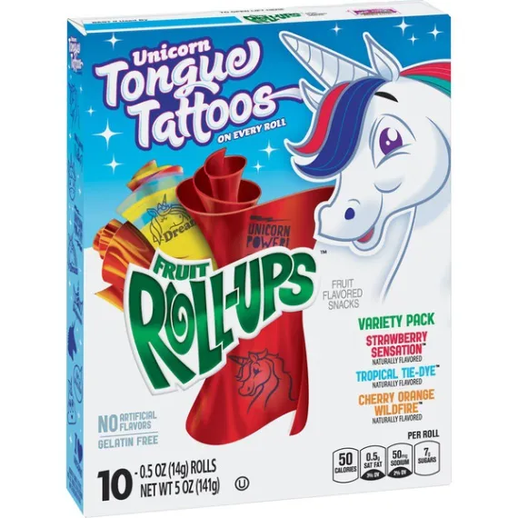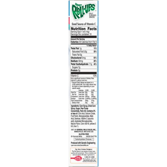 Details Ingredients Corn Syrup, Dried Corn Syrup, Sugar, Pear Puree Concentrate, Palm Oil. Contains 2% or Less of: Citric Acid, Sodium Citrate, Fruit Pectin, Monoglycerides, Malic Acid, Dextrose, Vitamin C (Ascorbic Acid), Acetylated Monoglycerides, Natural Flavor, Color (Red 40, Yellows 5 & 6, Blue 1). Show more Product features Fruit-flavored, gummy treats made with no artificial flavors for a delicious gelatin free, gluten free snack NATURALLY FLAVORED: Fruit-flavored, gummy treats made with no artificial flavors for a delicious gelatin free, gluten free snack WHOLESOME: Contains a good source of Vitamin C for a sweet snack you can feel great about SNACKS FOR KIDS: With tongue tattoos on every roll, the possibilities for fun are endless ON-THE-GO SNACK: 50 calories per roll, these individual snacks are the perfect addition to any day out BOX CONTAINS: 1 box, 10 total strawberry sensation, tropical tie-dye and cherry orange wildfire fruit roll-up kids snacks fruit snack, fruit snacks, fruit strip, fruit strips, fruit shape, fruit shapes, lunchbox snack, lunchbox snacks, gluten free snack, gluten free lunchbox snack, gluten free Special Features Naturally flavored Net Quantity of Content 10 X 1 roll (14g)