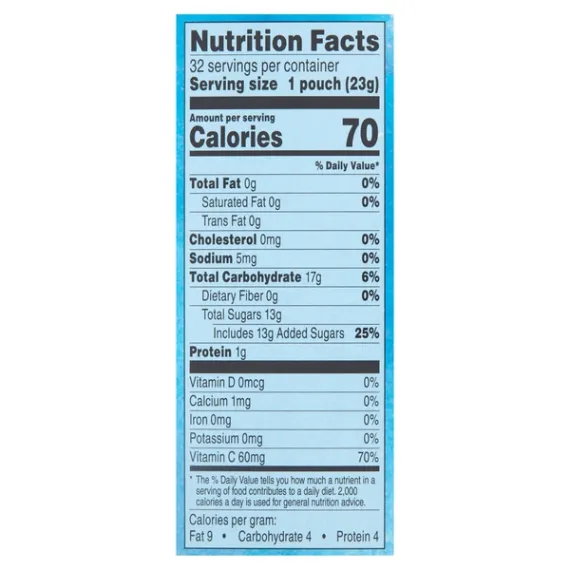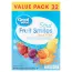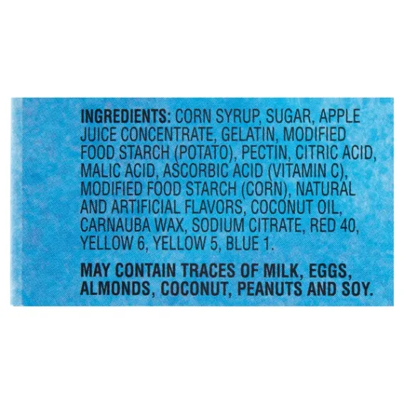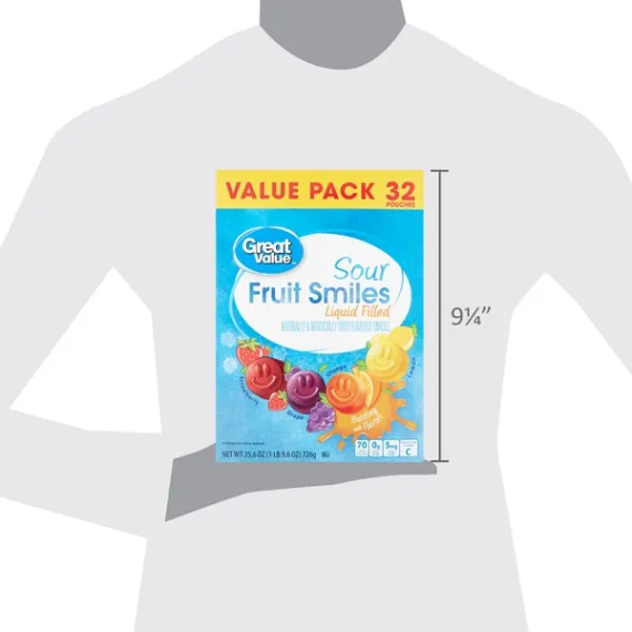 Details Ingredients Corn Syrup, Sugar, Apple Juice Concentrate, Gelatin, Modified Food Starch (Potato), Pectin, Citric Acid, Malic Acid, Ascorbic Acid (Vitamin C), Modified Food Starch (Corn), Natural and Artificial Flavors, Coconut Oil, Carnauba Wax, Sodium Citrate, Red 40, Yellow 6, Yellow 5, Blue 1 Show more Product features Naturally & Artificially Fruit-Flavored SnacksThe Great Value Liquid Filled Sour Fruit Smiles Value Pack is sure to be your little one's favorite dessert or sweet snack. Each soft and chewy, liquid-filled sour smile is bursting with flavor from the moment you take your first bite. This value pack contains a whopping 32 individually packaged pouches, and each is a single serving of 70 calories. You will feel great snacking on these knowing there are 0 grams of trans fat and only 5 milligrams of sodium per serving. Each pouch is packed with vitamin C and has a variety of exciting flavors like strawberry, grape, orange, and lemon. These delicious artificial and natural flavors will have you smiling just as big as the smiles on each gummy. The convenient pouches are perfect for packed lunches, afternoon snacks, or parties. Great Value Liquid Filled Sour Fruit Smiles Value Pack are mouthwatering sour gummies with a bold rush of juicy, delicious flavor.Great Value products provide families with affordable, high quality grocery and household consumable options. With our wide range of product categories spanning grocery and household consumables, we offer you a variety of products for your family's needs. Our products are conveniently available online and in Walmart stores nationwide, allowing you to stock up and save money at the same time. Sour fruit snacks32 pouchesLiquid-filledExcellent source of vitamin C Net Quantity of Content 32 X 1 pouch (23g)