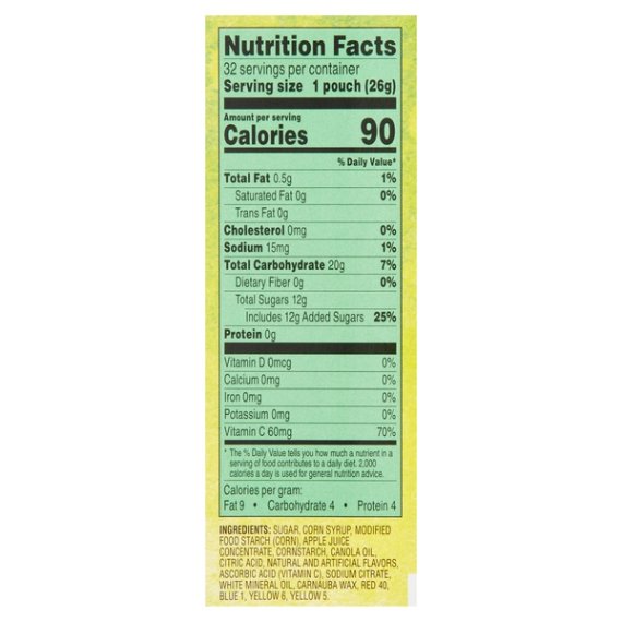 Details Ingredients SUGAR, CORN SYRUP, APPLE JUICE FROM CONCENTRATE, MODIFIED CORNSTARCH, CORNSTARCH, CANOLA OIL, CITRIC ACID, NATURAL & ARTIFICIAL FLAVORS, ASCORBIC ACID (VITAMIN C), SODIUM CITRATE, WHITE MINERAL OIL, CARNAUBA WAX, RED 40, BLUE 1, YELLOW 6, YELLOW 5. Show more Product features Naturally & Artificially Fruit-Flavored SnacksEnjoy an exciting burst of tangy, fruity flavor inside every pouch of Great Value Tangy Fruit Smiles Value Pack. These fun, bite-sized fruit snacks come in tropical punch, blue raspberry, sour apple, and watermelon flavors, and are packed with the healthy antioxidant vitamin C. They also contain no gluten, cholesterol, or saturated fat, making them an excellent snacking option for the health-conscious consumer. These tangy fruit snacks come in a value pack of 32, so you'll always have one on hand when hunger strikes. Throw one of these 90-calorie packs in your lunch for work or school, or in your bag on a road trip for yummy snacking on the go. You can also add our delicious tangy fruit smiles to a trail mix or baking recipe for a fun twist on a traditional treat. When you're craving a delightful, fruity snack, reach for Great Value Tangy Fruit Smiles Value Pack. Great Value products provide families with affordable, high quality grocery and household consumable options. With our wide range of product categories spanning grocery and household consumables, we offer you a variety of products for your family's needs. Our products are conveniently available online and in Walmart stores nationwide, allowing you to stock up and save money at the same time. Naturally & artificially fruit-flavored snacksMega Pack -- 32 pouchesTropical punch, blue raspberry, sour apple, and watermelon90 calories per serving0g saturated fatNo cholesterolGluten-free15mg sodiumExcellent source of vitamin CRecyclable paper box Net Quantity of Content 32 X 26 g