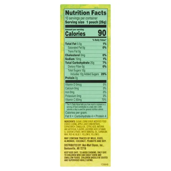 Details Ingredients Sugar, Corn Syrup, Modified Food Starch (Corn), Apple Juice Concentrate, Cornstarch, Canola Oil, Citric Acid, Natural and Artificial Flavors, Ascorbic Acid (Vitamin C), Sodium Citrate, White Mineral Oil, Carnauba Wax, Red 40, Blue 1, Yellow 6, Yellow 5 Show more Product features Enjoy an exciting burst of tangy, fruity flavor inside every pouch of Great Value Tangy Fruit Smiles Fruit-Flavored Snacks. These fun, bite-sized fruit snacks come in tropical punch, blue raspberry, sour apple, and watermelon flavors, and are packed with the healthy antioxidant vitamin C. They also contain no gluten, cholesterol, or saturated fat, making them an excellent snacking option for the health-conscious consumer. Throw one of these 90-calorie packs in your lunchbox for work or school, or in your bag on a road trip for yummy snacking on the go. When you're craving a delightful, fruity snack, reach for Great Value Tangy Fruit Smiles Fruit-Flavored Snacks. Great Value products provide families with affordable, high quality grocery and household consumable options. With our wide range of product categories spanning grocery and household consumables, we offer you a variety of products for your family's needs. Our products are conveniently available online and in Walmart stores nationwide, allowing you to stock up and save money at the same time. 10 pouches Tropical punch, blue raspberry, sour apple, and watermelon 90 calories per serving No cholesterol 0g saturated fat Gluten-free 15mg sodium Excellent source of vitamin C Special Features Made with real juice Net Quantity of Content 10 X 1 pouch (26g)