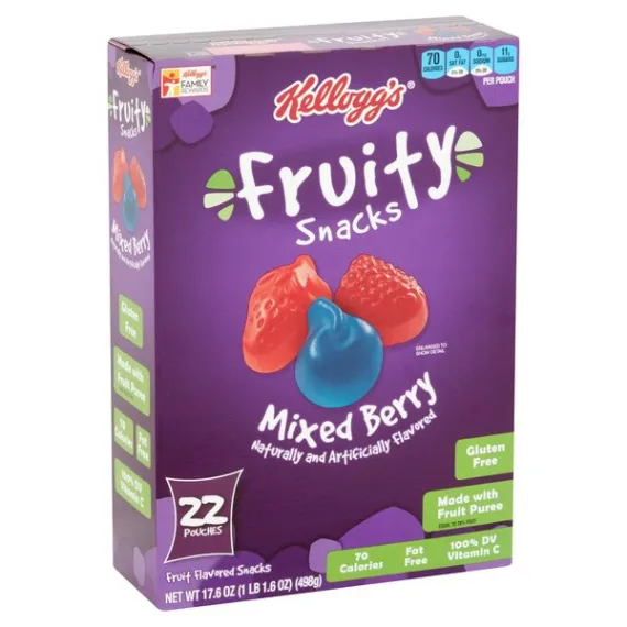 Details Ingredients CORN SYRUP, SUGAR, APPLE PUREE CONCENTRATE, WATER, MODIFIED CORN STARCH, GELATIN, CONTAINS 2% OR LESS OF CITRIC ACID, VITAMIN C (ASCORBIC ACID), NATURAL AND ARTIFICIAL FLAVORS, RED 40, BLUE 1. Show more Product features Fruit Flavored Snack: Kellogg Fruity Snacks in a fun-filled and better-for-you snacking form. Made with real fruit Low fat. Low cholesterol. Excellent source vitamin C. Delightfully chewy treats made with fruit puree, Kellogg's Fruity Snacks are sweet, tasty, and great for kids and adultsFun, bite-sized fruit-shaped snacks with the yummy flavors of sweet strawberry, blueberry, and raspberry in every bagNo high-fructose corn syrup; Fat free; Gluten free; 100% daily value of Vitamin C; Made with fruit puree equal to 20% fruit; 70 calories per servingStock your home pantry, keep on hand at the office, and stow in a school lunchbox, backpack, or tote bag; Enjoy during game time and at sporting events; A travel-ready foodIncludes 1, 17.6-ounce family-sized snack box containing 22 single-serve pouches of ready-to-eat Fruity Snacks Mixed Berry; Packaged for freshness and great taste Net Quantity of Content 22 X 22 g
