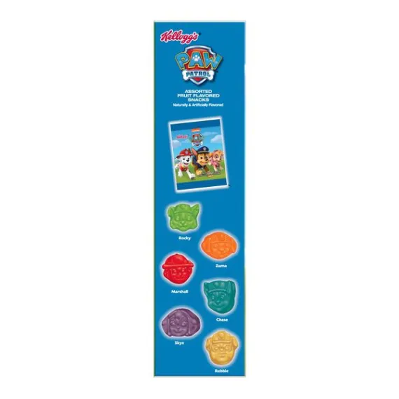 Details Ingredients Corn syrup, sugar, apple puree concentrate, modified food starch, water, gelatin.Contains 2% or less of citric acid, natural and artificial flavors, vitamin C (ascorbic acid), palm and coconut oil*, carnauba wax, yellow 5, red 40, sodium citrate, blue 1. Show more Product features Kellogg’s PAW Patrol Assorted Fruit Flavored Snacks are tasty, sweet, and just a little bit tart. A sweet snack made with fruit puree, these fruity bites provide an excellent source of Vitamin C in each serving and are fat-free and gluten-free. With the flavors of sweet fruit, these delicious fruity chews are travel-friendly and easy to stow in a lunchbox, backpack, or tote bag. Conveniently packaged in individually wrapped pouches, it’s a snap to grab a bag on your way out the door, keep a few stashed at your desk, or stock your pantry to share with family and friends. • Delightfully chewy treats made with fruit puree, PAW Patrol Assorted Fruit Flavored Snacks are sweet, tasty, and great for kids• Delicious bite-sized snacks in fun, PAW Patrol-inspired shapes with sweet, yummy fruit flavors in every bag• Fat free; Gluten free; An excellent source of Vitamin C; Made with fruit puree; 70 calories per serving• Stock your home pantry, keep on hand at the office, and stow in a school lunchbox, backpack, or tote bag; Enjoy during game time and at sporting events; A travel-ready food• Includes 1, 17.6-ounce snack box containing 22 single-serve pouches of ready-to-eat PAW Patrol Assorted Fruit Flavored Snacks; Packaged for freshness and great taste Net Quantity of Content 22.0 X 22 g