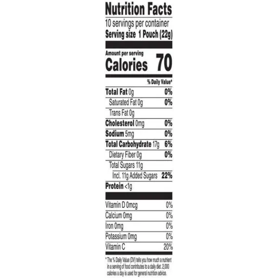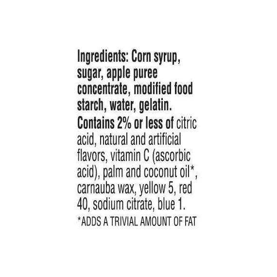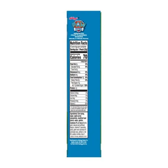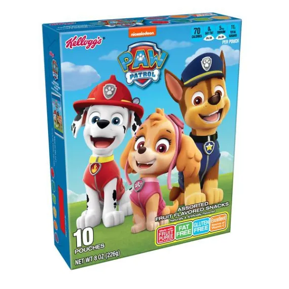 Details Ingredients Corn syrup, sugar, apple puree concentrate, modified food starch, water, gelatin.Contains 2% or less of citric acid, natural and artificial flavors, vitamin C (ascorbic acid), palm and coconut oil*, carnauba wax, yellow 5, red 40, sodium citrate, blue 1. Show more Product features Kellogg’s PAW Patrol Assorted Fruit Flavored Snacks are tasty, sweet, and just a little bit tart. A sweet snack made with fruit puree, these fruity bites provide an excellent source of Vitamin C in each serving and are fat-free and gluten-free. With the flavors of sweet fruit, these delicious fruity chews are travel-friendly and easy to stow in a lunchbox, backpack, or tote bag. Conveniently packaged in individually wrapped pouches, it’s a snap to grab a bag on your way out the door, keep a few stashed at your desk, or stock your pantry to share with family and friends. • Delightfully chewy treats made with fruit puree, PAW Patrol Assorted Fruit Flavored Snacks are sweet, tasty, and great for kids• Delicious bite-sized snacks in fun, PAW Patrol-inspired shapes with sweet, yummy fruit flavors in every bag• Fat free; Gluten free; An excellent source of Vitamin C; Made with fruit puree; 70 calories per serving• Stock your home pantry, keep on hand at the office, and stow in a school lunchbox, backpack, or tote bag; Enjoy during game time and at sporting events; A travel-ready food• Includes 1, 8-ounce snack box containing 10 single-serve pouches of ready-to-eat PAW Patrol Assorted Fruit Flavored Snacks; Packaged for freshness and great taste Net Quantity of Content 10.0 X 22 g