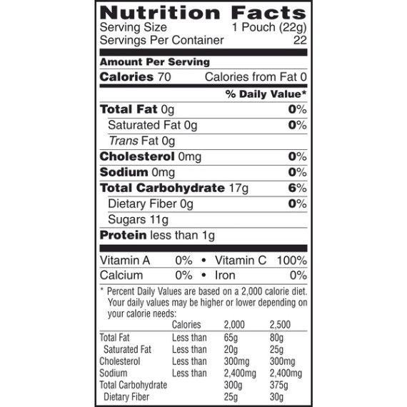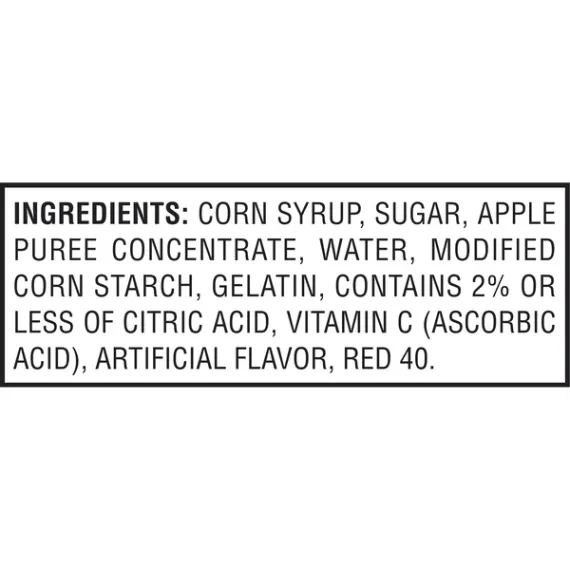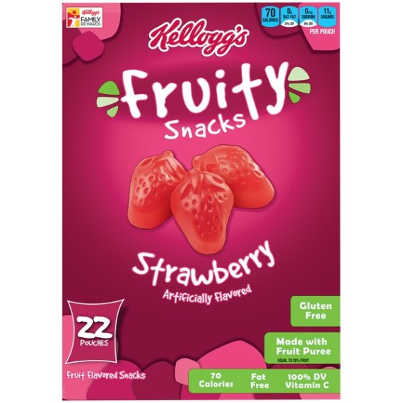Details Ingredients Corn Syrup, Sugar, Apple Puree Concentrate, Water, Modified Corn Starch, Gelatin, Contains 2% or less of Citric Acid, Vitamin C (Ascorbic Acid), Artificial Flavor, Red 40 Show more Product features Kellogg Fruity Snacks in a fun-filled and better-for-you snacking form. Made with real fruit. Low fat. Low cholesterol. Excellent source vitamin C. Kellogg's Strawberry Fruity Snacks:22 pouches70 calories per 22g pouchKellogg's snacks are made with real fruit100% daily value of vitamin CFat-freeGluten-freeFun for game daySuitable snack for gametimeGood snack for every sporting eventFind your favorite sport and game snackDelicious Superbowl munchiesGluten-free snacks with 22-count pouches are easy snackingIn the carOn the runEasy to pack in your child's lunchEnough for 2 school weeks Net Quantity of Content 22 X 22 G