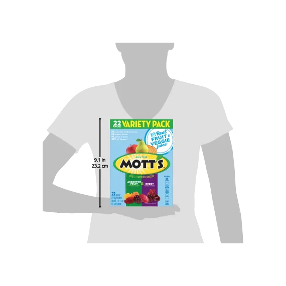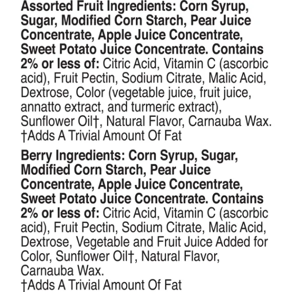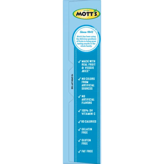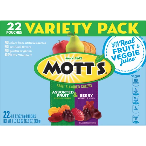 Details Ingredients Assorted Fruit: Corn Syrup, Sugar, Modified Corn Starch, Pear Juice Concentrate, Apple Juice Concentrate, Sweet Potato Juice Concentrate. Contains 2% or Less of: Citric Acid, Vitamin C (Ascorbic Acid), Fruit Pectin, Sodium Citrate, Malic Acid, Dextrose, Color (Vegetable Juice, Fruit Juice, Annatto Extract, and Turmeric Extract), Sunflower Oil†, Natural Flavor, Carnauba Wax.Berry: Corn Syrup, Sugar, Modified Corn Starch, Pear Juice Concentrate, Apple Juice Concentrate, Sweet Potato Juice Concentrate. Contains 2% or Less of: Citric Acid, Vitamin C (Ascorbic Acid), Fruit Pectin, Sodium Citrate, Malic Acid, Dextrose, Vegetable and Fruit Juice Added for Color, Sunflower Oil†, Natural Flavor, Carnauba Wax.†Adds a Trivial Amount of Fat. Show more Product features Mott's Medleys Assorted Fruit and Berry Flavored Snacks are made with real fruit and veggie juice and have 100% of your daily vitimine C. They contain no gelatin, gluten, artificial flavors or colors. They're also just 80 calories and fat free! Gummy treats made with real fruit and veggie juice*, no artificial flavors and no colors from artificial sources A wholesome and tasty snack that is fat free with 100% Daily Value Vitamin C Fruit pouches in your favorite fruit shapes; the perfect snacks for kids Individual packs that are a convenient lunch time treat Mott’s fruit flavored snacks are simple and easy fruity snacks to enjoy anytime, anywhere fruit snack, fruit snacks, fruit strip, fruit strips, fruit shape, fruit shapes, lunchbox snack, lunchbox snacks, gluten free snack, gluten free lunchbox snack, gluten free, Box Tops, Box Tops For Education Net Quantity of Content 22 X 1 pouch (23g)