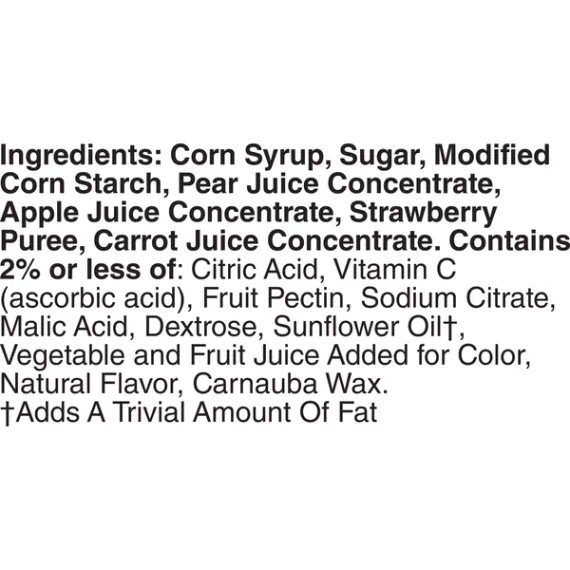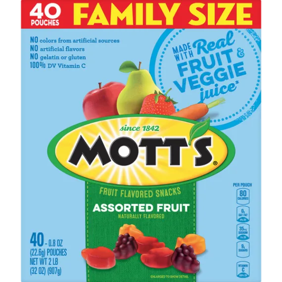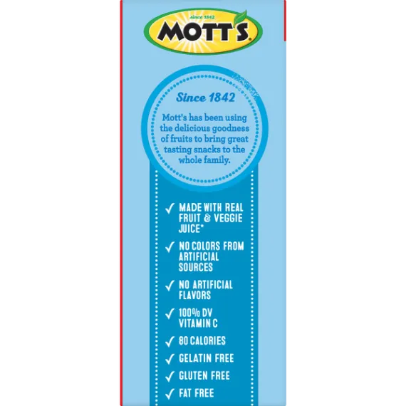 Details Ingredients Corn Syrup, Sugar, Modified Corn Starch, Pear Juice Concentrate, Apple Juice Concentrate, Sweet Potato Juice Concentrate. Contains 2% or Less of: Citric Acid, Vitamin C (Ascorbic Acid), Fruit Pectin, Sodium Citrate, Malic Acid, Dextrose, Color (Vegetable Juice, Fruit Juice, Annatto Extract, and Turmeric Extract), Sunflower Oil†, Natural Flavor, Carnauba Wax.†Adds a Trivial Amount of Fat. Show more Product features Mott's Assorted Fruit Flavored Snacks are made with real fruit and veggie juice, and have 100% of your daily vitimine C. They contain no gelatin, gluten, artificial flavors or colors. They're also just 80 calories and fat free! NATURALLY FLAVORED: Gummy treats made with real fruit and veggie juice*, no artificial flavors and no colors from artificial sources WHOLESOME: A tasty snack that is fat free with 100% Daily Value Vitamin C VARIETY SNACK PACKS: Fruit pouches in your favorite fruit shapes; the perfect snacks for kids ON-THE-GO SNACK: 80 calories per pouch, these individual snacks are an easy addition to any day out BOX CONTAINS: Bulk snacks; 1 box, 40 total pouches of variety snacks *These fruit-flavored snacks are made with pear, apple, and carrot juice concentrates and strawberry puree. See label for a complete list of ingredients. They are not intended to replace fruit or vegetables in the diet. fruit snack, fruit snacks, fruit strip, fruit strips, fruit shape, fruit shapes, lunchbox snack, lunchbox snacks, gluten free snack, gluten free lunchbox snack, gluten free Net Quantity of Content 40 X 23.0
