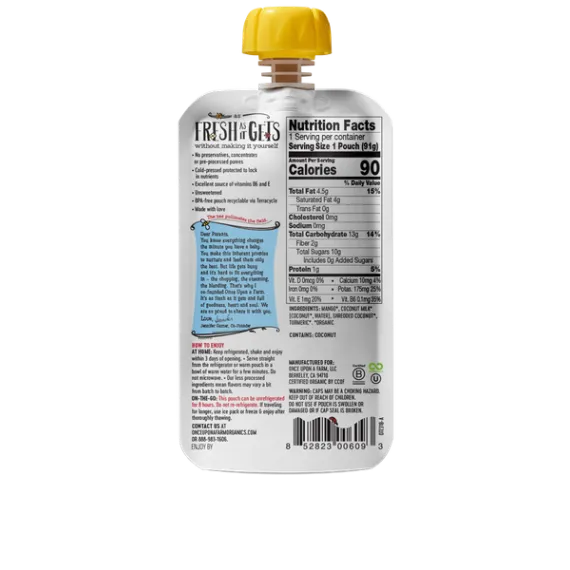 Details Ingredients Organic Mango, Organic Coconut Milk, Organic Shredded Coconut, Organic Turmeric. Product features • Organic, Non-GMO, Cold-Pressed Baby Food, Gold-y Mango & the 3 Coconuts, Stage 3 (9+ Months), 3.2oz Pouch • 1/4 mango. 1/8 c coconut milk. 1 tbsp shredded coconut. 1 tsp turmeric. • It’s a lively bunch! Finding a nutrient-dense meal for your little one is easy when you combine pure unsweetened mangoes, rich in vitamin A and B6, with the comfort of omega-rich coconut milk. Live healthy ever after with this just-right comfort food combination. • Once Upon a Farm organic, non-GMO, cold-pressed, refrigerated baby food and applesauce blends are just like homemade, but with the added magic of cold-pressure (HPP) to lock in the nutrients, taste and texture of farm fresh ingredients. No preservatives, concentrates or pre-processed purees, BPA free pouch recyclable via Terracycle, pediatrician recommended and made with love, Once Upon a Farm organic blends are as close to the farm as it gets! • Certified Organic, Non-GMO Project Verified, Cold-Pressed, Gluten-Free, Vegan, Kosher, Whole Fruits and Veggies, Farm to Family Recipes, Unsweetened, No Fillers, No Additives or Preservatives Once Upon A Farm Gold-y Mango & the 3 Coconuts - 3.2oz Pouch Net Quantity of Content 1 X 91 g