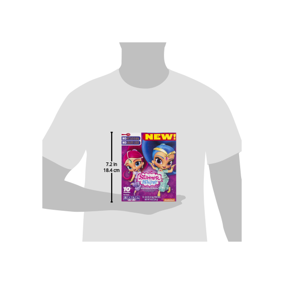 Details Ingredients Corn Syrup, Modified Corn Starch, Apple Juice Concentrate. Contains 2% or less of: Citric Acid, Fruit Pectin, Sodium Citrate, Malic Acid, Dextrose, Vitamin C (Ascorbic Acid), Sunflower Oil†, Color (Vegetable Juice, Spirulina Extract, Fruit Juice, Annatto Extract, and Turmeric Extract), Natural Flavor, Carnauba Wax.†Adds a Trivial Amount of Fat. Show more Product features Kids of all ages will love these naturally flavored, gluten free gummy treats. No artificial flavors or colors, just 80 calories and fat free. They're also an excellent source of vitamin C. New! Betty Crocker Shimmer & Shine Fruit Flavored Snacks 10ct carton. Assorted Fruit Flavors Naturally Flavored. No Artificial Flavors; No Colors From Artificial Sources; Natural Flavors; Excellent Source of Vitamin C; 80 Calories; Gluten Free; Fat Free Betty Crocker shimmer and shine fruit flavored snacks 10ct carton are a fruit flavored gummy treat in fun shapes and flavors Made with no artificial flavors or preservatives Contains an excellent source of Vitamin C Perfect for lunchboxes or snack time Delicious option for kids and a portable grab and go treat Shimmer and Shine™ Fruit Flavored Snacks.New!. No artificial flavors. No colors from artificial sources. Assorted fruit flavors. Naturally flavored. Per pouch: 80 Calories. 0g Sat fat, 0% DV. 30mg Sodium, 1% DV. 9g Sugars. 10 - 0.8 oz (22.6g) pouches. Net Wt 8 oz (226 g). Net Quantity of Content 10 X 1.0
