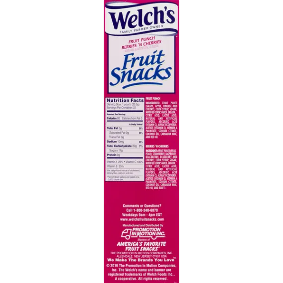 Details Ingredients Fruit Punch: Fruit Puree (Grape, Apple, Orange and Cherry), Corn Syrup, Sugar, Modified Corn Starch, Gelatin, Citric Acid, Lactic Acid, Natural and Artificial Flavors, Ascorbic Acid (Vitamin C), Alpha Tocopherol Acetate (Vitamin E), Vitamin A Palmitate, Sodium Citrate, Coconut Oil Carnauba Wax, and Red 40. Berries 'n Cherries: Fruit Puree (Pear, Peach, Strawberry, Raspberry, Blackberry, Blueberry and Cherry), Corn Syrup, Sugar, Modified Corn Starch, Gelatin, Citric Acid, Lactic Acid, Natural and Artificial Flavors, Ascorbic Acid (Vitamin C), Alpha Tocopherol Acetate (Vitamin E), Vitamin A Palmitate, Sodium Citrate, Coconut Oil Carnauba Wax, Red 40, and Blue 1. Show more Product features The Welch's name has been built on the highest quality fruit proudly grown on family farms. In this tradition of goodness come Welch's Fruit Snacks, bite-sized snacks that are made with real fruit for the delicious taste the whole family loves. Welch's Fruit Snacks are fat free and each serving contains 100% of your daily recommended value of vitamin C and 25% of vitamins A and E. Gluten-free and delicious, Welch's Fruit Snacks are sure to delight your family. At Welch's, We Put The Fruit In Fruit Snacks. Fruit is Our 1st Ingredient!Family Farmed OwnedValue Pack22 80 Calorie PouchesWe Make The Brands You Love™ Net Quantity of Content 22.0 X 25.50 g