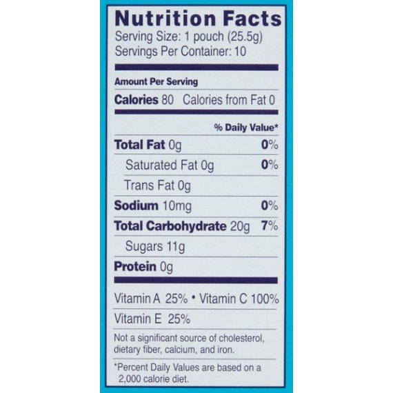 Details Ingredients Fruit Puree (Grape, Peach, Orange, Strawberry, and Raspberry), Corn Syrup, Sugar, Modified Corn Starch, Gelatin Concord Grape Juice from Concentrate, Citric Acid, Lactic Acid, Natural and Artificial Flavors, Ascorbic Acid (Vitamin C), Alpha Tocopherol Acetate (Vitamin E), Vitamin A Palmitate, Sodium Citrate, Coconut Oil, Carnauba Wax, Annatto (Color), Turmeric (Color), Red 40, and Blue 1. Show more Product features The Welch's name has been built on the highest quality fruit proudly grown on family farms. In this tradition wholesome goodness come Welch's fruit snacks, made with real fruit and fruit juices. Welch's fruit snacks are sure to delight your family. Please try all of our delicious Welch's fruit snacks varieties, and thank you for the trust you place in Welch's.We make the brands you love Welch's Fruit Snacks Mixed Fruit - 10 CT.Family farmer owned.Natural & artificial flavors.Now with more fruit.100% vitamin C DV per serving.25% vitamins A & E.Fat free.Gluten free.No preservatives.Per pouch: 80 calories.0g sat fat, 0% DV.10mg sodium, 0% DV.11g sugars.The Welch's name has been built on the highest quality fruit, proudly grown on family farms.In this tradition of goodness come Welch's fruit snacks, now made with even more real fruit.Welch's fruit snacks are sure to delight your family.Please try all of our delicious varieties, and thank you for the trust you place in Welch's.100% Recycled Paperboard.Promotion in Motion Inc.Makers of America's Favorite Fruit Snacks.We Make The Brands You Love.Comments or questions?Call 1-800-340-6870.Weekdays 9am - 4pm EST.www.welchsfruitsnacks.com.2015 The Promotion in Motion Companies, Inc.The Welch's name and banner are registered trademarks of Welch Foods Inc., A cooperative.All rights reserved. Net Quantity of Content 10 X 1 Pouch (25.5g)