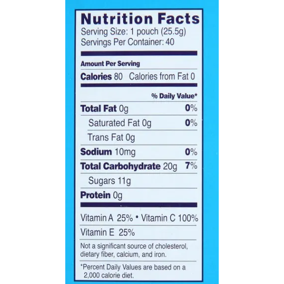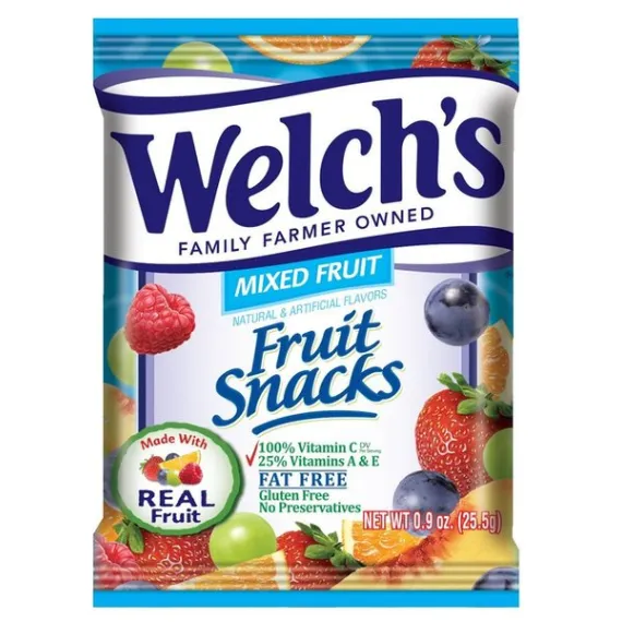 Details Ingredients FRUIT PUREE (GRAPE, PEACH, ORANGE, STRAWBERRY, AND RASPBERRY), CORN SYRUP, SUGAR, MODIFIED CORN STARCH, GELATIN, CONCORD GRAPE JUICE FROM CONCENTRATE, CITRIC ACID, LACTIC ACID, NATURAL AND ARTIFICIAL FLAVORS, ASCORBIC ACID (VITAMIN C), ALPHA TOCOPHEROL ACETATE (VITAMIN E), VITAMIN A PALMITATE, SODIUM CITRATE, COCONUT OIL, CARNAUBA WAX, ANNATTO (COLOR), TURMERIC (COLOR), RED 40, AND BLUE 1. Show more Product features Welch's& 174; Fruit Snacks Mixed Fruit. Made from real fruit with natural & artificial flavors. This product is free from gluten and fat. There are no preservatives. Welch's& 174; Fruit Snacks are sure to delight your family as part of a balanced diet including fruits, vegetables, grains, proteins and dairy. Welch's® Fruit Snacks Mixed Fruit.Family farmer owned.80 Calorie pouches.Fruit is our 1st ingredient!.Natural & artificial flavors.Made with real fruit.DV per serving: 100% Vitamin C. 25% Vitamins A & E. Fat free.Gluten free.No preservatives.Per pouch: 80 Calories.0g Sat fat, 0% DV.10mg Sodium, 0% DV.11g Sugars.40 - 0.9 oz.(25.5 g) Pouches.Net Wt 2.3 lbs.(1 kg). Net Quantity of Content 40 X 25.5 g