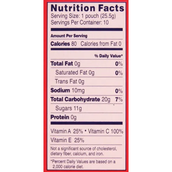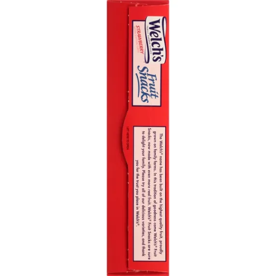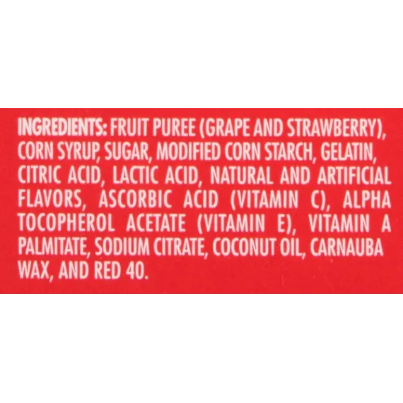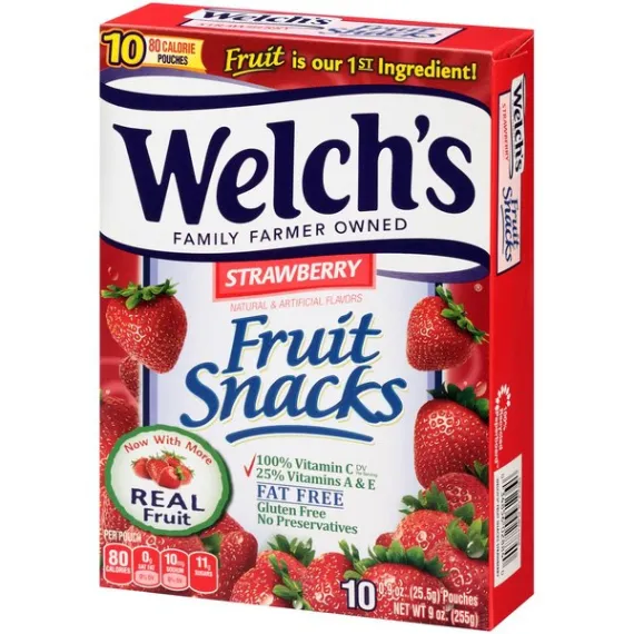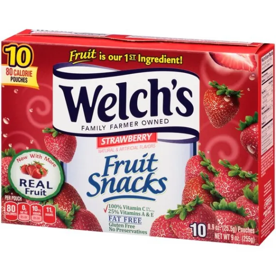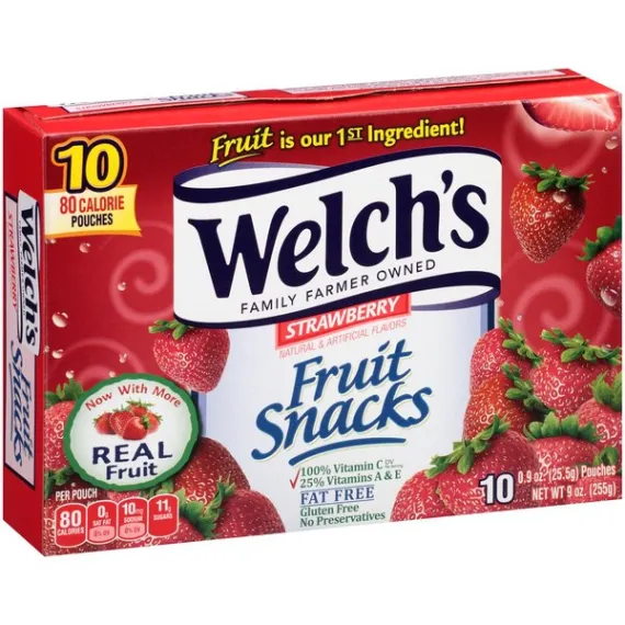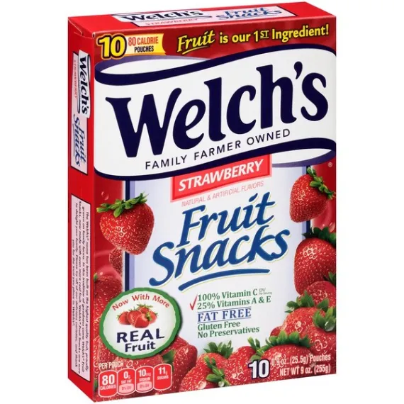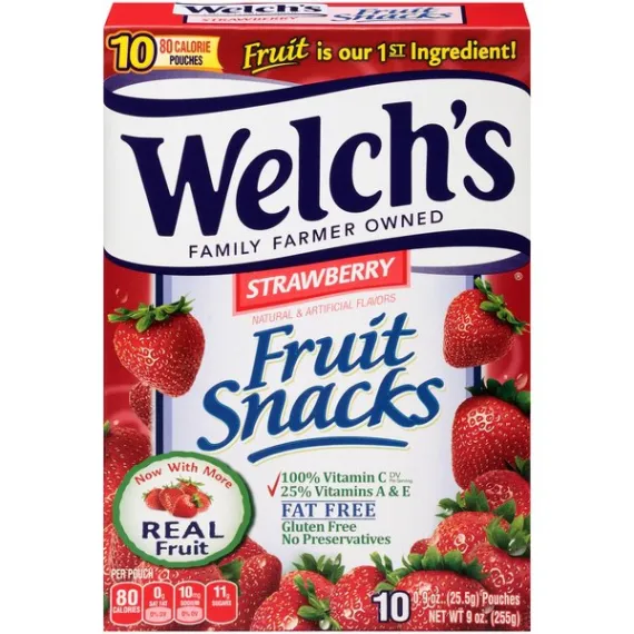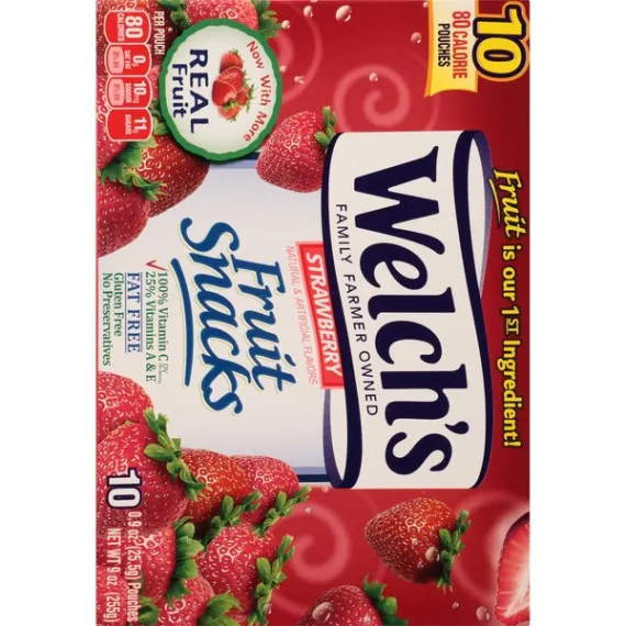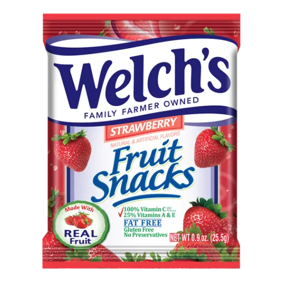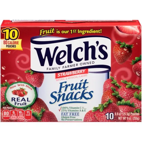Details Ingredients FRUIT PUREE (GRAPE AND STRAWBERRY), CORN SYRUP, SUGAR, MODIFIED CORN STARCH, GELATIN, CITRIC ACID, LACTIC ACID, NATURAL AND ARTIFICIAL FLAVORS, ASCORBIC ACID (VITAMIN C), ALPHA TOCOPHEROL ACETATE (VITAMIN E), VITAMIN A PALMITATE, SODIUM CITRATE, COCONUT OIL, CARNAUBA WAX, AND RED 40. Show more Product features The Welch's® name has been built in the highest quality fruit, proudly grown on family farms. In this tradition of goodness come Welch's® Fruit Snacks, now made with even more real fruit. Welch's® Fruit Snacks are sure to delight your family. Please try all of out delicious varieties, and than you for the trust you place in Welch's®.We make the brands you love Family Farmer OwnedAmerica's Favorite Fruit Snacks®We Make The Brands You Love™10 80 Calorie Pouches Net Quantity of Content 10 X 25.5 g