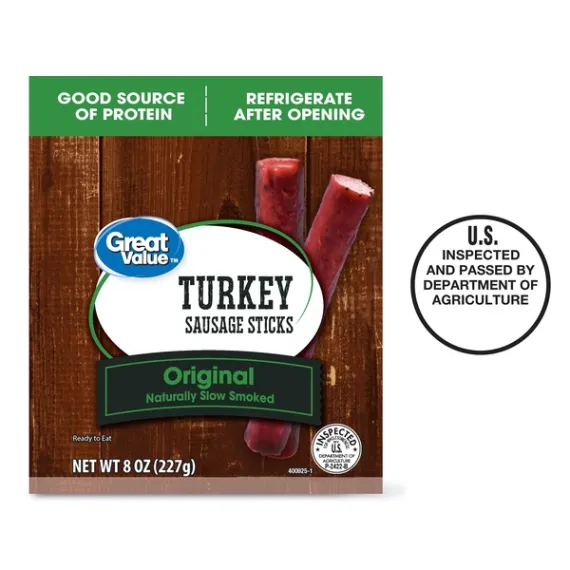 Details Ingredients TURKEY, MECHANICALLY SEPARATED TURKEY, CONTAINS LESS THAN 2% OF: SALT, CORN SYRUP SOLIDS, SPICES, DEXTROSE, LACTIC ACID STARTER CULTURE, CARRAGEENAN, SODIUM ERYTHORBATE, GARLIC POWDER, SODIUM NITRITE. IN COLLAGEN CASING. Show more Product features Make snacktime a little more exciting when you purchase Great Value Turkey Sausage Sticks. These original meat sticks are perfect when you’re on the road or need a quick protein boost in between meals. Featuring a rich smoked flavor, these turkey sticks are USDA inspected and ready to eat. Just grab them before your next hike or trip to the gym, or pack one in your kiddo’s school lunch to ensure they’re getting important nutrients. The sticks come in a handy, resealable package, making it easy to store after opening. It’s time to step it up a notch with Great Value Turkey Sausage Sticks!Great Value products provide families with affordable, high-quality grocery and household consumable options. With our wide range of product categories spanning grocery and household consumables, we offer you a variety of products for your family's needs. Our products are conveniently available online and in Walmart stores nationwide, allowing you to stock up and save money at the same time. Great Value Turkey Sausage Sticks, 8 oz:Naturally slow smokedReady to eatGreat source of proteinUSDA Inspected Net Quantity of Content 7 X 2 Sticks
