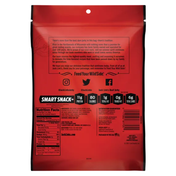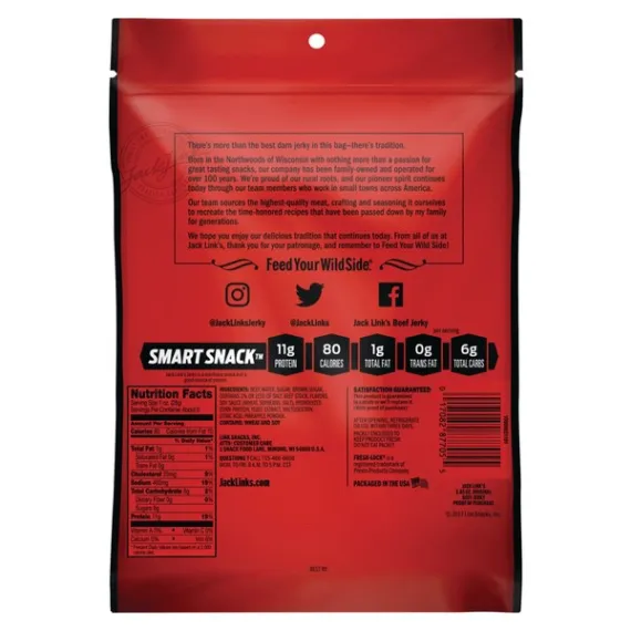 Details Ingredients Beef, Water, Sugar, Brown Sugar, Contains 2% Or Less Of Salt, Beef Stock, Flavors, Soy Sauce (Wheat, Soybeans, Salt), Hydrolyzed Corn Protein, Yeast Extract, Maltodextrin, Citric Acid, Pineapple Powder. Show more Product features A jumbo Size bag of Beef Jerky large enough for even Sasquatch to share. Jack Link's Original Beef Jerky is seasoned with a hint of garlic and hardwood smoked to savory perfection, itâs the one and only original. Give your gut a protein-packed punch when hunger strikes. Original Flavored Beef JerkyContains 1 bag of 5.85oz jerkyMeets USDA Smart Snack nutrition standards for schoolsHigh in protein, low in fat and carb smartClean label snack with no added MSG or perservatives Special Features Low fat Net Quantity of Content ABOUT 6 X 1 oz