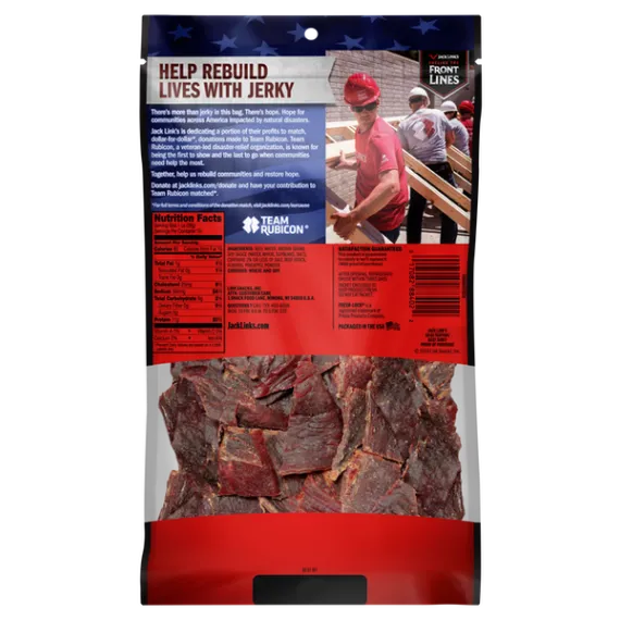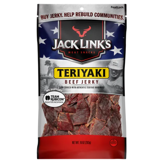 Details Ingredients Beef, Water, Brown Sugar, Soy Sauce (Water, Wheat, Soybeans, Salt), Contains 2% Or Less Of Salt, Beef Stock, Flavors, Pineapple Powder. Product features A sasquatch size bag of beef jerky large enough to share with friends or save for later. Jack Links Teriyaki Beef Jerky is made with a bold and flavorful mix of soy, ginger and onion. Thank you ?ÂÂperson-who-invented-teriyaki?ÂÂ. You might not have known it then but this incredibly tantalizing jerky is the reason you created that delicious soy-ginger sauce. Go ahead and give your gut a protein-packed punch when hunger strikes. Jack Link's Beef Jerky Value Size, Teriyaki, 10oz Net Quantity of Content 1 Count Of 10oz Jerky X 1 oz (28 g)