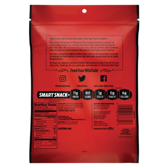 Details Ingredients Beef, Water, Brown Sugar, Soy Sauce (Water, Wheat, Soybeans, Salt), Contains 2% Or Less Of Salt, Beef Stock, Flavors, Pineapple Powder. Product features A jumbo size bag of beef jerky large enough for even SASQUATCH to share. Jack Links Teriyaki Beef Jerky is made with a bold and flavorful mix of soy, ginger and onion. Thank you “person-who-invented-teriyaki”. You might not have known it then but this incredibly tantalizing jerky is the reason you created that delicious soy-ginger sauce. Go ahead and give your gut a protein-packed punch when hunger strikes. Teriyaki Flavored Beef JerkyContains 1 bag of 5.85oz jerkyMeets USDA Smart Snack nutrition standards for schoolsHigh in protein, low in fat and carb smartClean label snack with no added MSG or perservatives Special Features Low fat Net Quantity of Content ABOUT 6 X 1 oz