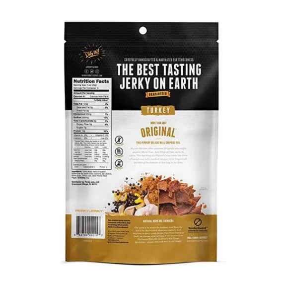 Details Ingredients TURKEY BREAST, REDUCED SODIUM GLUTEN-FREE SOY SAUCE (WATER, SOYBEANS, SALT, ALCOHOL), BROWN SUGAR, LEMON JUICE, GARLIC POWDER, BLACK PEPPER. Show more Product features Enjoy a delicious snack with the Turkey Perky Original Jerky (5 oz.). Each serving has 10g of protein, which is ideal for maintaining and growing muscle tissue. This Turkey Perky jerky is low in calories, which makes it easy to add to your well-managed diet. There are no added preservatives, nitrites or MSG so you can enjoy it with peace of mind. Turkey Perky Original Jerky:All-natural, turkey jerky carefully handcrafted and marinated overnightExcellent healthy, portable snack10g proteinLow fat jerkyLow calorieGluten-freeNo added MSG, preservatives or nitritesOriginal flavor Net Quantity of Content 5 X 1 oz