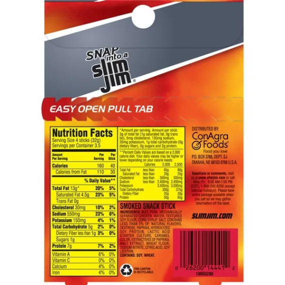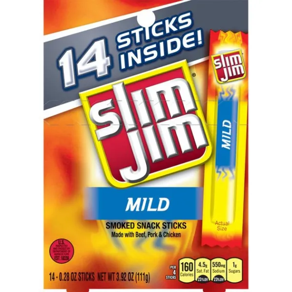 Details Ingredients Beef, Pork, Mechanically Separated Chicken, Water, Textured Soy Flour, Corn Syrup, Salt, Contains less than 2% of: Natural Flavors, Dextrose, Paprika, Hydrolyzed Soy Protein, Lactic Acid Starter Culture, Caramel Color, Extractives of Paprika, Malt Extract, Wheat Flour, Sodium Nitrite, Citric Acid, Soy Lecithin. CONTAINS: SOY, WHEAT. Show more Product features Slim Jim is America’s #1 brand of meat stick. Individually wrapped Slim Jim Mild Flavored Smoked Snack Stick, perfect for snacking on the go. Each 4-meat-stick serving is loaded with 6 g protein and made with beef, pork, and chicken, because beefy appetites require an even beefier snack. Slim Jim offers a full line of beef sticks, snack sticks, and beef jerky. Get intense, smoky flavor with delicious Slim Jim Mild Flavored Smoked Snack Stick. Individually wrapped for a quick and easy meat snackSlim Jim meat sticks use spicy beef, pork, and chicken, because beefy appetites require an even beefier snackIndividually wrapped snack sticks for an easy, on-the-go meat feast that’ll kick hunger to the curbThe intensely bold Mild Flavor is prime for snack time, lunchtime, after school, or anytime—carry one on you in caseContains (14).28 oz Slim Jim Mild Flavored Smoked Snack Sticks0 g trans fat per serving Net Quantity of Content 3.5 X 32g