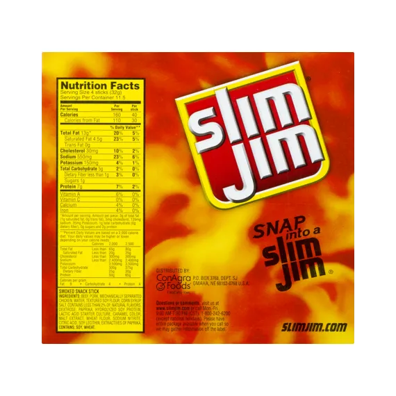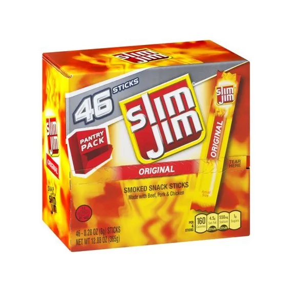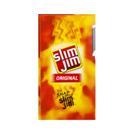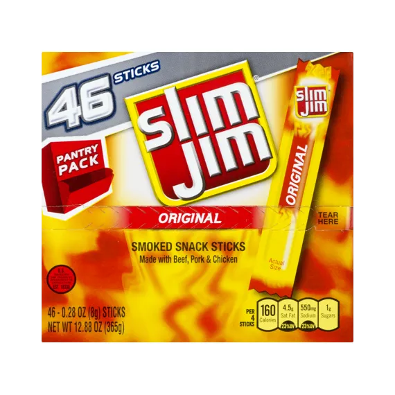 Details Ingredients Beef, Pork, Mechanically Separated Chicken, Water, Textured Soy Flour, Corn Syrup, Salt, Contains less than 2% of: Natural Flavors, Dextrose, Paprika and Extractives of Paprika, Hydrolyzed Soy Protein, Maltodextrin, Lactic Acid Starter Culture, Barley Malt Extract, Citric Acid, Soy Lecithin, Sodium Nitrite. CONTAINS: SOY. Show more Product features Slim Jim is America's #1 brand of meat stick. Slim Jim snack sticks are made with beef, pork, and chicken, because beefy appetites require an even beefier snack. Each pantry pack contains 46 snack sticks and stores easily to grab a snack and go. Get intense, smoky flavor with Slim Jim Original Flavored Smoked Snack Sticks. Individually wrapped for a quick and easy meat snack Slim Jim meat sticks use spicy beef, pork, and chicken, because beefy appetites require an even beefier snack. Convenient design to quickly grab a meat stick and go 7 grams of protein per serving 0.28-ounce Slim Jim Original Flavored Smoked Snack Stick Net Quantity of Content 1.0 X 8g
