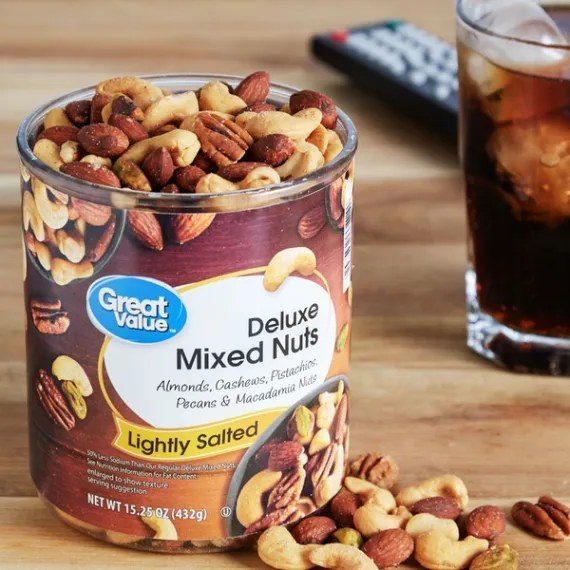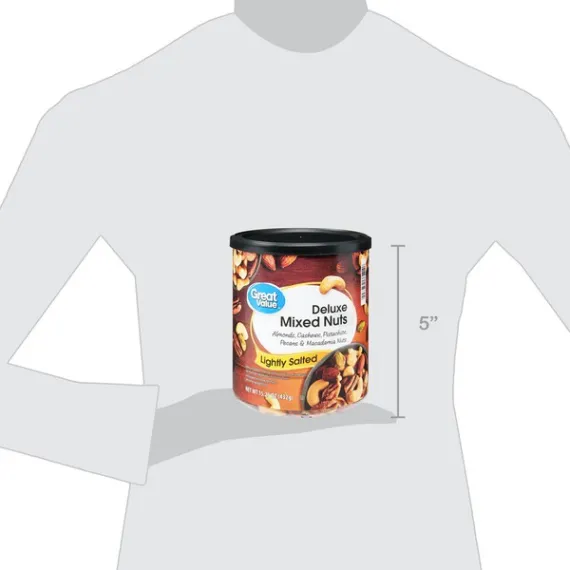 Details Ingredients ALMONDS, CASHEWS, PISTACHIO NUTS, PECANS, MACADAMIA NUTS, VEGETABLE OIL (PEANUT OIL, COTTONSEED OIL, SOYBEAN OIL AND/OR SUNFLOWER OIL), SEA SALT. Show more Product features Great Value Lightly Salted Deluxe Mixed Nuts offers a terrific variety of specialty nuts gently seasoned with pure sea salt. This protein-packed, heart-healthy mix contains crunchy almonds, cashews, pistachios, pecans, and macadamia nuts. Our premium-quality nut mixture comes in a convenient 15.25 oz resealable canister, allowing for our mix to stay fresh for whenever hunger strikes. Wholesome snacking made easy, this blend is great for breaktime, after-school, or even on the go in the car while you are driving towards your destination. Add this mouth-watering mixture to your favorite granola or trail mix for a crispy and crunchy snack that will crush cravings and satisfy hunger any time of the day. When you want a snack that's great and great for you, reach for Great Value Lightly Salted Deluxe Mixed Nuts. Great Value products provide families with affordable, high quality grocery and household consumable options. With our wide range of product categories spanning grocery and household consumables, we offer you a variety of products for your family's needs. Our products are conveniently available online and in Walmart stores nationwide, allowing you to stock up and save money at the same time. Great Value Lightly Salted Deluxe Mixed Nuts, 15.25 oz: Mixture of crunchy almonds, cashews, pistachios, pecans and macademia nuts Contains 40mg sodium compared to 80mg sodium in our deluxe salted mixed nuts 170 calories and 0 trans fat per serving Lightly seasoned with sea salt Excellent any time snack Net Quantity of Content ABOUT 15 X 1 oz